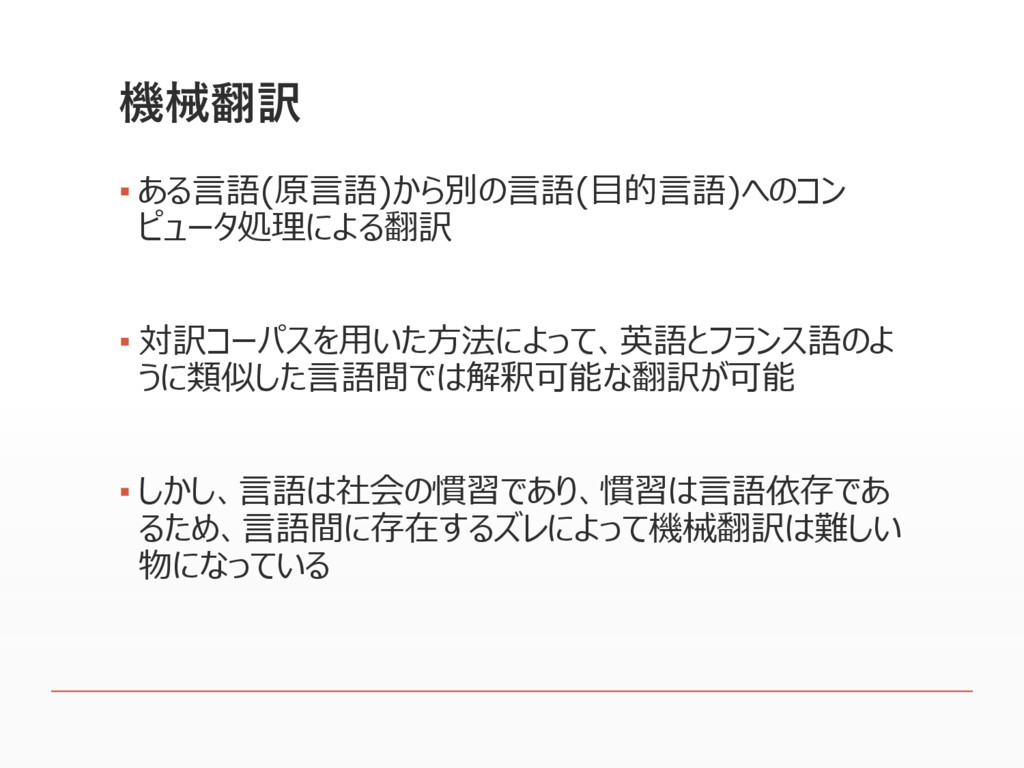 機械翻訳 ▪ ある言語(原言語)から別の言語(目的言語)へのコン ピュータ処理による翻訳 ▪ 対訳コーパスを用いた方法によって、英語とフランス語のよ うに類似した言語間では解釈可能な翻訳が可能 ▪ しかし、言語は社会の慣習であり、慣習は言語依存であ るため、言語間に存在するズレによって機械翻訳は難しい