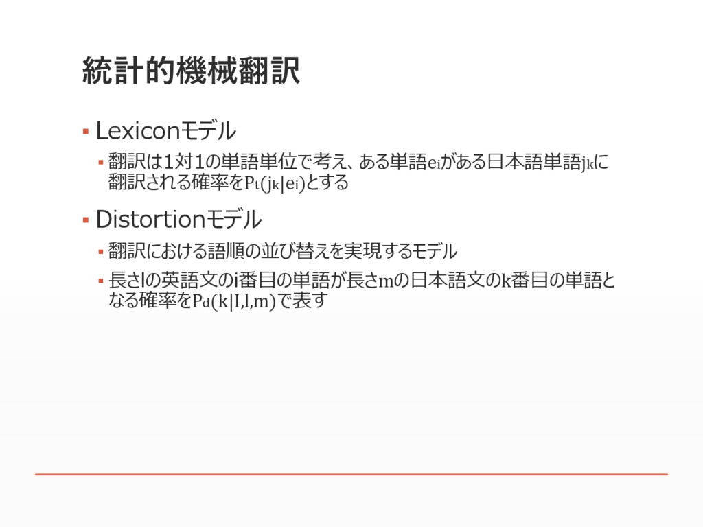 統計的機械翻訳 ▪ Lexiconモデル ▪ 翻訳は1対1の単語単位で考え、ある単語eiがある日本語単語jkに 翻訳される確率をPt(jk|ei)とする ▪ Distortionモデル ▪ 翻訳における語順の並び替えを実現するモデル