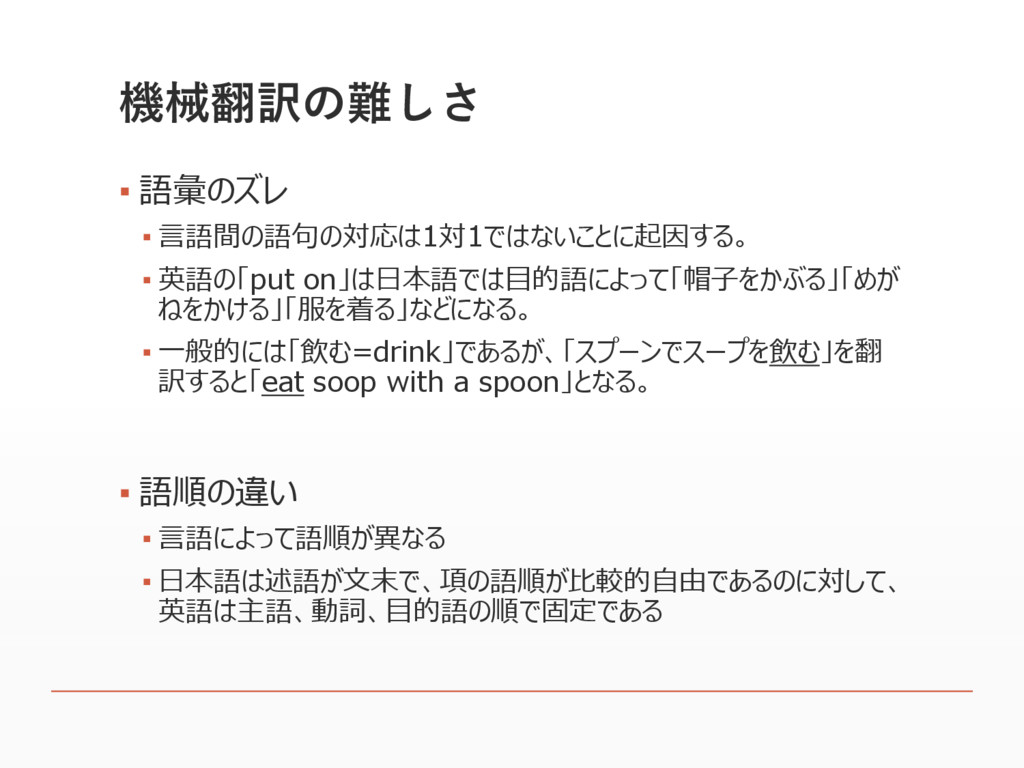 機械翻訳の難しさ ▪ 語彙のズレ ▪ 言語間の語句の対応は1対1ではないことに起因する。 ▪ 英語の「put on」は日本語では目的語によって「帽子をかぶる」「めが ねをかける」「服を着る」などになる。 ▪