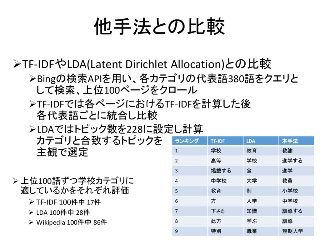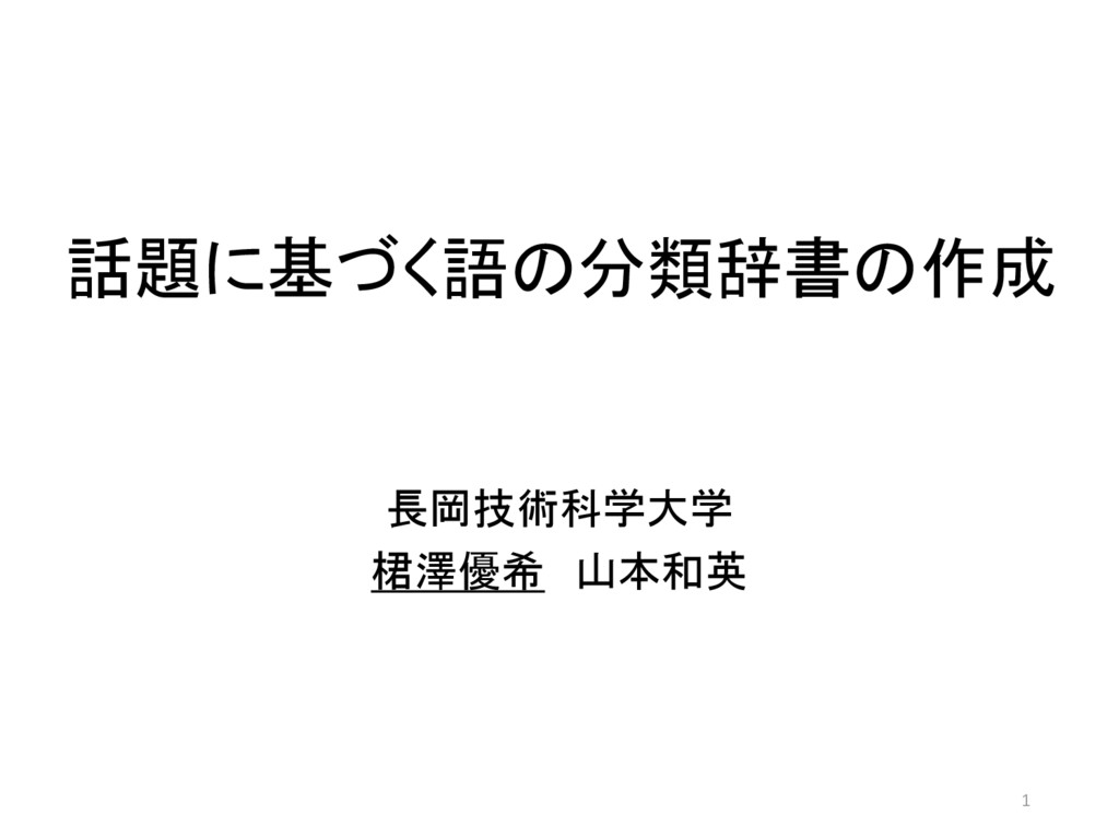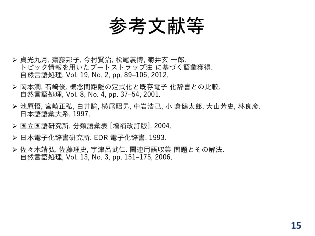 自然言語処理, Vol. 19, No. 2, pp. 89–106, 2012. 岡本潤, 石崎俊. 概念間距離の定式化と既存電子 化辞書との比較. 自然言語処理, Vol. 8, No. 4, pp. 37–54, 2001. 池原悟, 宮崎正弘, 白井諭, 横尾昭男, 中岩浩己, 小 倉健太郎, 大山芳史, 林良彦. 日本語語彙大系. 1997. 国立国語研究所. 分類語彙表 [増補改訂版]. 2004. 日本電子化辞書研究所. EDR 電子化辞書. 1993. 佐々木靖弘, 佐藤理史, 宇津呂武仁. 関連用語収集 問題とその解法. 自然言語処理, Vol. 13, No. 3, pp. 151–175, 2006. 15