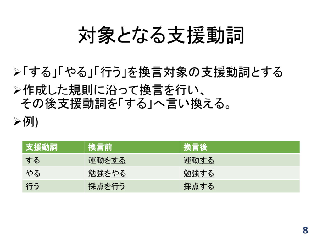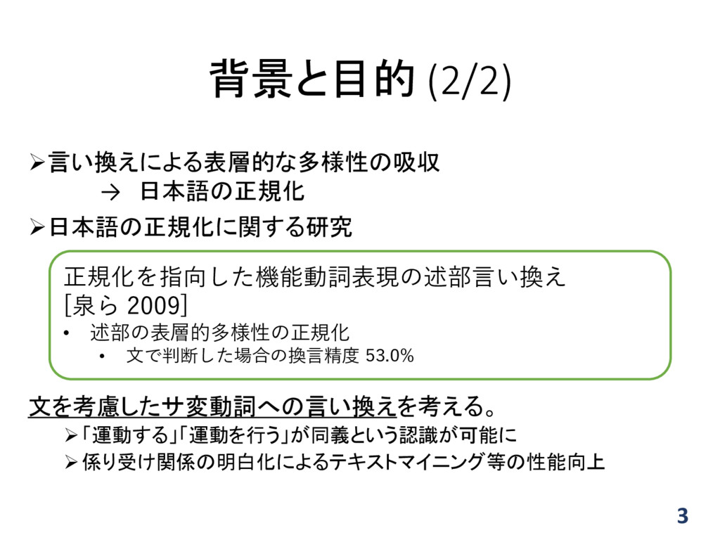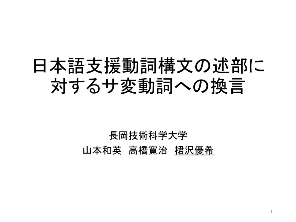 Yuki Mikami, and Yuta Sudo. What we need is word, not morpheme; constructing word analyzer for Japanese. Proceedings of the International Conference on Asian Language Processing (IALP 2015), pp. 49-52, Oct 2015. Kazuhide Yamamoto and Kanji Takahashi. Construction of Japanese semantically compatible words resource. Proceedings of the International Conference on Asian Language Processing (IALP 2015), pp. 61-64, Oct 2015. 佐藤理史. 論文表題を言い換える. 情報処理学会. 論文誌, Vol. 40, No. 7, pp. 2937-2945, Jul 1999. 泉朋子,今村賢治,菊井玄一郎,藤田篤,佐藤理史. 正規化を指向した機能動詞表現の述部言い換え. 言語処理学会第15回年次大会発表論文集, pp. 264-267, Mar 2009. 影山太郎.文法と語形成.ひつじ書房, 1993. 14
