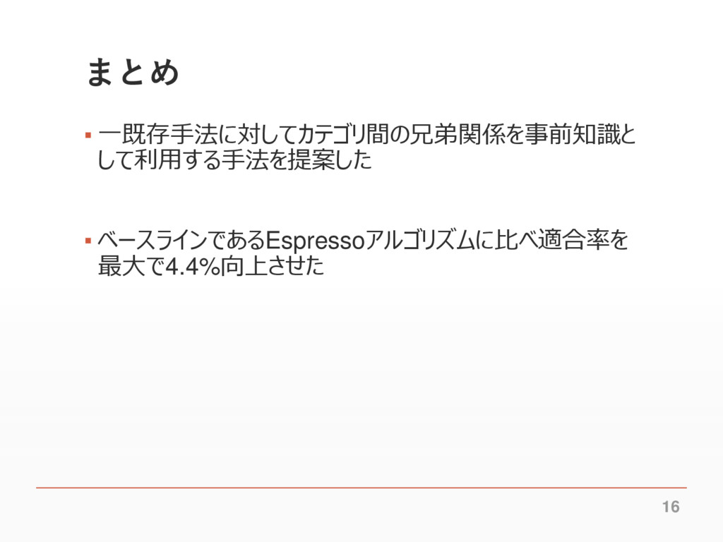 まとめ ▪ 一既存手法に対してカテゴリ間の兄弟関係を事前知識と して利用する手法を提案した ▪ ベースラインであるEspressoアルゴリズムに比べ適合率を 最大で4.4%向上させた 16