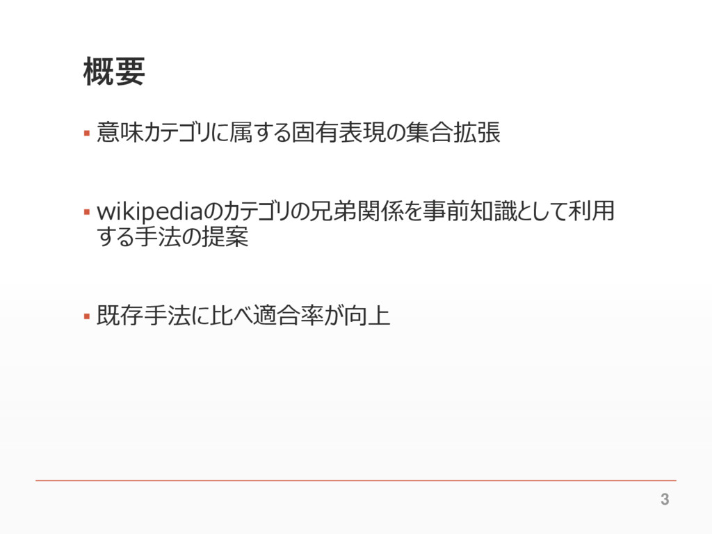 概要 ▪ 意味カテゴリに属する固有表現の集合拡張 ▪ wikipediaのカテゴリの兄弟関係を事前知識として利用 する手法の提案 ▪ 既存手法に比べ適合率が向上 3