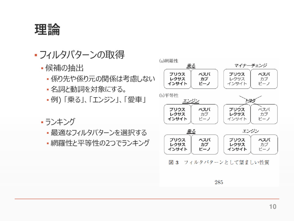 例) 「乗る」、「エンジン」、「愛車」 ▪ ランキング ▪ 最適なフィルタパターンを選択する ▪ 網羅性と平等性の2つでランキング 10
