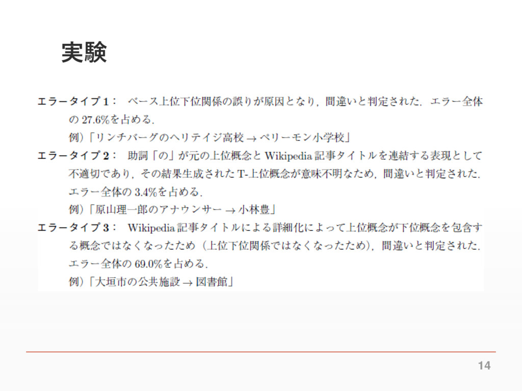 実験 ▪ 2009-09-27版の日本語Wikipediaデータを用いてG- 上位下位関係を取得 ▪ 上位下位関係が妥当か以下のペアについて評価 ▪ ベース上位下位関係 ▪ G-上位概念ペア