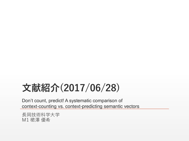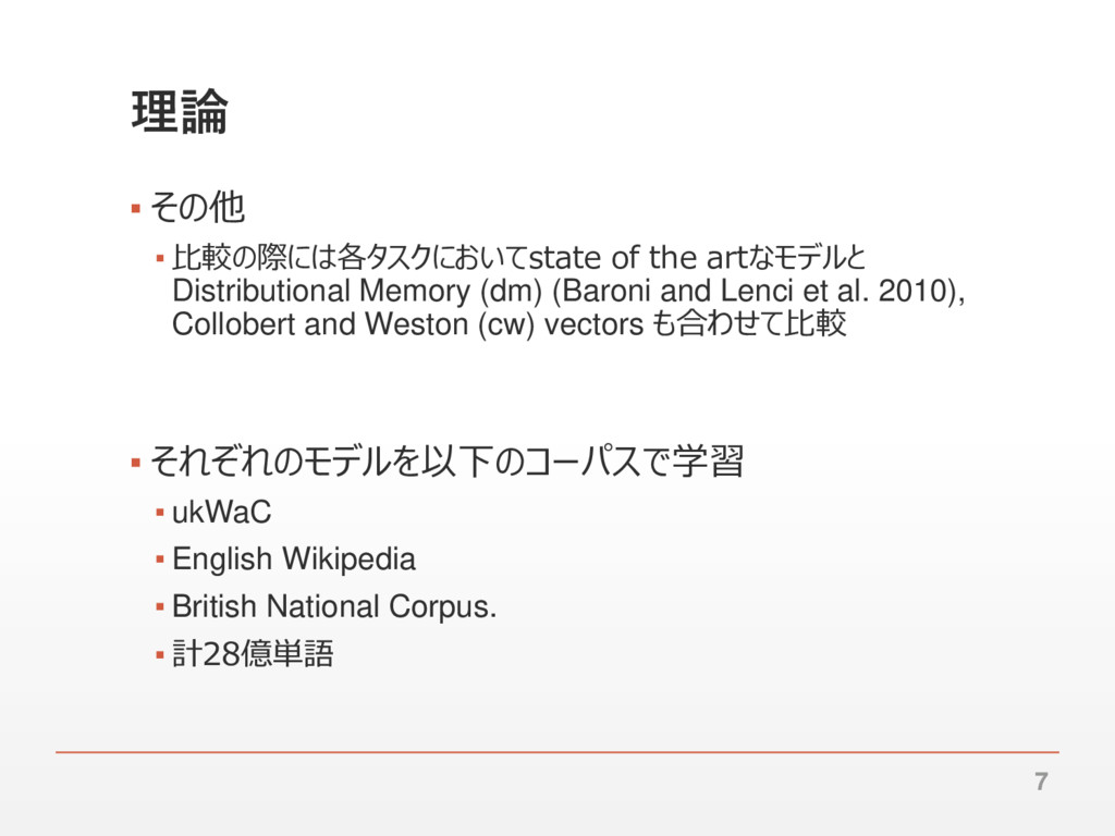 German Kruszewski Center for Mind/Brain Sciences (University of Trento, Italy) ▪ Don’t count, predict! A systematic comparison of context- counting vs. context-predicting semantic vectors ▪ Proceedings of the 52nd Annual Meeting of the Association for Computational Linguistics, pages 238–247, Baltimore, Maryland, USA, June 23-25 2014. ▪ キーワード ▪ PMI, WordEmbedding 2