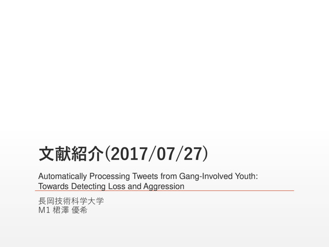 MacBeth, Jamie and McKeown, Kathleen and Patton, Desmond and Rambow, Owen ▪ Automatically Processing Tweets from Gang-Involved Youth: Towards Detecting Loss and Aggression ▪ Proceedings of COLING 2016, the 26th International Conference on Computational Linguistics: Technical Papers. ▪ pp.2196-2206 ▪ キーワード ▪ 対話分析,Twitter 2