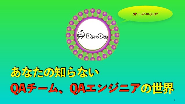 2020-11-03(火)14:00 - 16:00 DevLOVEで開催した 「あなたの知らないQAチーム、QAエンジニアの世界」 のイベントのオープニングスライドです。 https://devlove.doorkeeper.jp/events/112964
