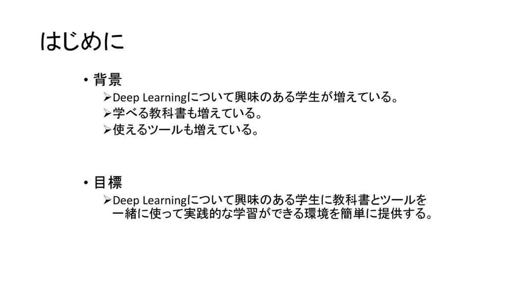 はじめに • 背景 Deep Learningについて興味のある学生が増えている。 学べる教科書も増えている。 使えるツールも増えている。 • 目標 Deep