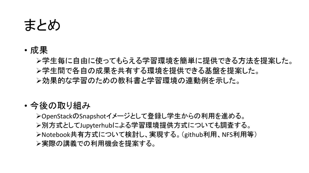 まとめ • 成果 学生毎に自由に使ってもらえる学習環境を簡単に提供できる方法を提案した。 学生間で各自の成果を共有する環境を提供できる基盤を提案した。 効果的な学習のための教科書と学習環境の連動例を示した。 • 今後の取り組み OpenStackのSnapshotイメージとして登録し学生からの利用を進める。 別方式としてJupyterhubによる学習環境提供方式についても調査する。