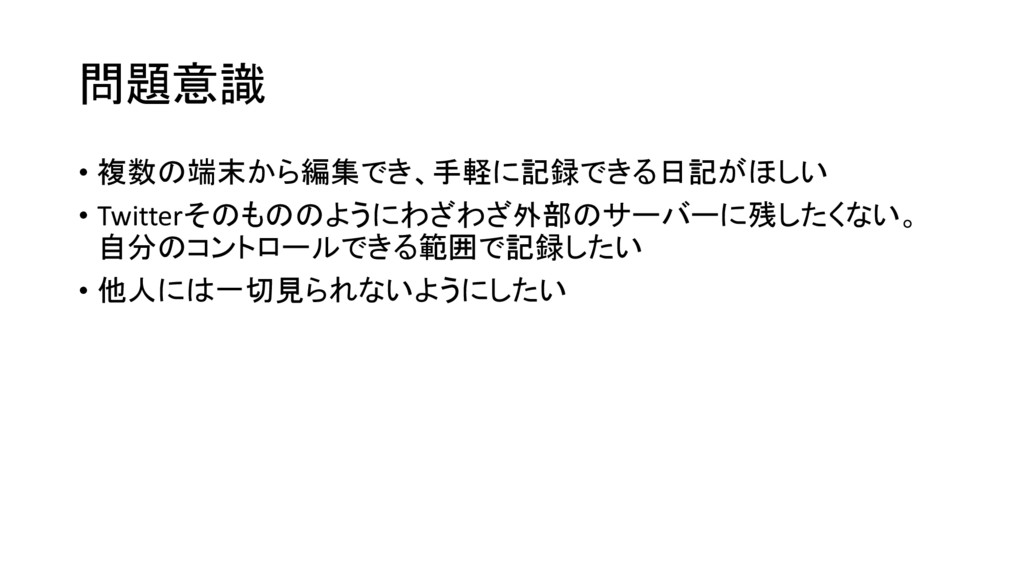 問題意識 • 複数の端末から編集でき、手軽に記録できる日記がほしい • Twitterそのもののようにわざわざ外部のサーバーに残したくない。 自分のコントロールできる範囲で記録したい • 他人には一切見られないようにしたい
