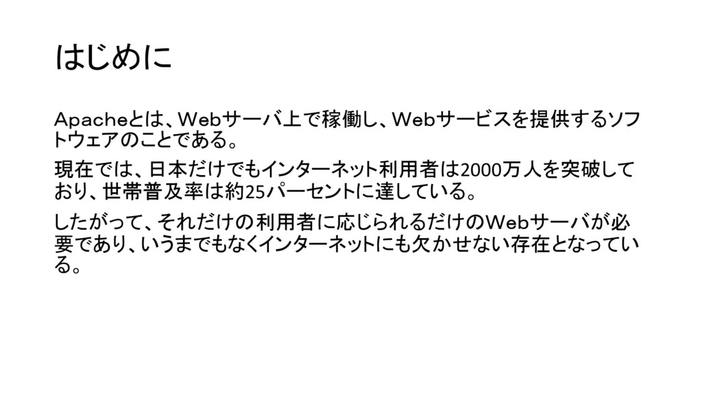はじめに Apacheとは、Webサーバ上で稼働し、Webサービスを提供するソフ トウェアのことである。 現在では、日本だけでもインターネット利用者は2000万人を突破して おり、世帯普及率は約25パーセントに達している。 したがって、それだけの利用者に応じられるだけのWebサーバが必 要であり、いうまでもなくインターネットにも欠かせない存在となってい る。