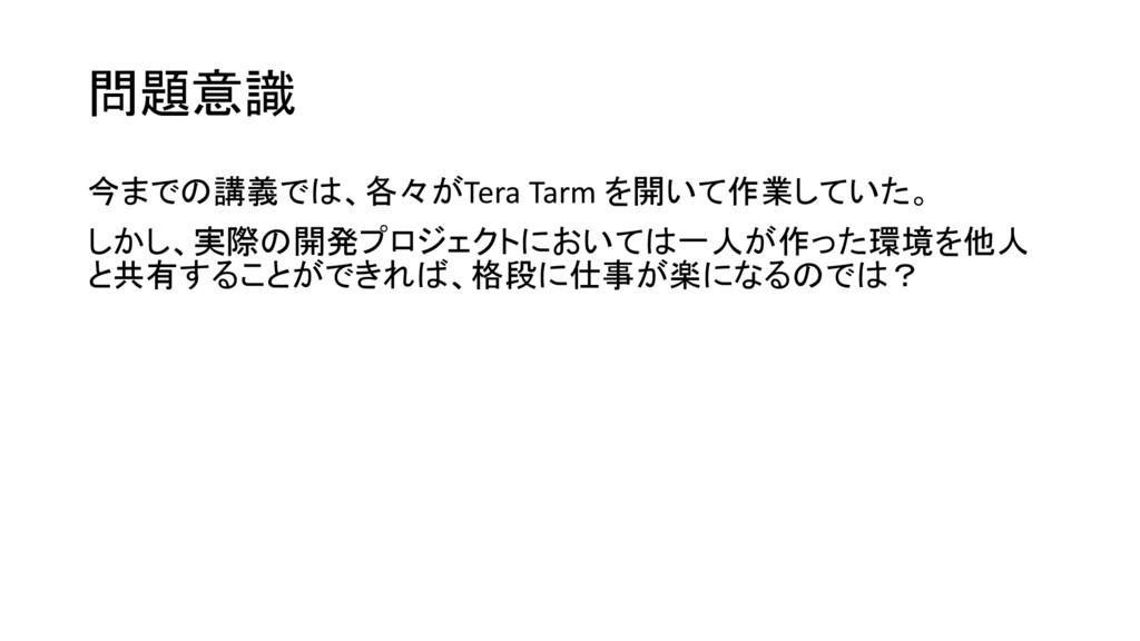 問題意識 今までの講義では、各々がTera Tarm を開いて作業していた。 しかし、実際の開発プロジェクトにおいては一人が作った環境を他人 と共有することができれば、格段に仕事が楽になるのでは?