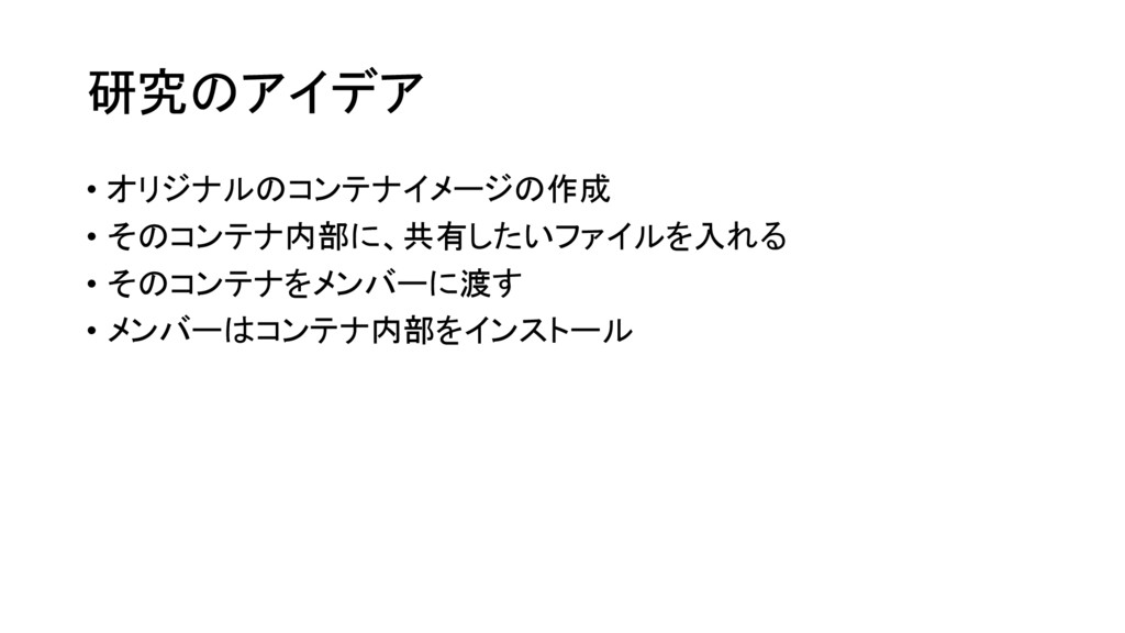 研究のアイデア • オリジナルのコンテナイメージの作成 • そのコンテナ内部に、共有したいファイルを入れる • そのコンテナをメンバーに渡す • メンバーはコンテナ内部をインストール