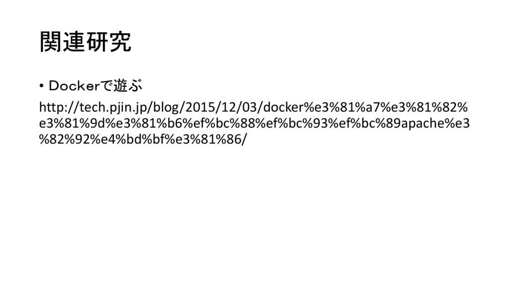 関連研究 • Dockerで遊ぶ http://tech.pjin.jp/blog/2015/12/03/docker%e3%81%a7%e3%81%82% e3%81%9d%e3%81%b6%ef%bc%88%ef%bc%93%ef%bc%89apache%e3 %82%92%e4%bd%bf%e3%81%86/