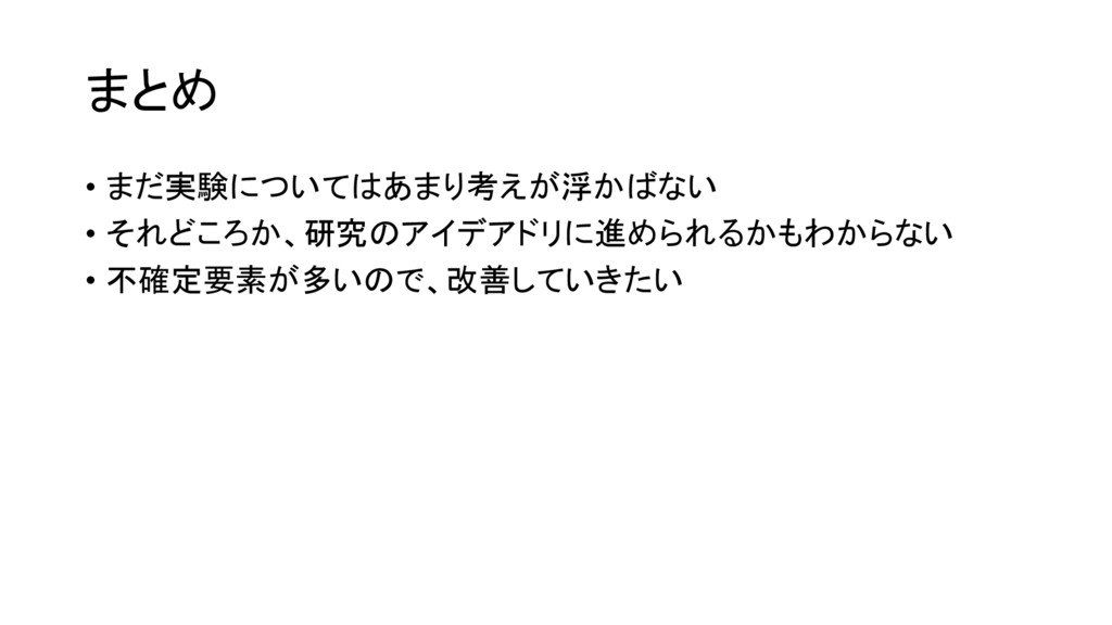 まとめ • まだ実験についてはあまり考えが浮かばない • それどころか、研究のアイデアドリに進められるかもわからない • 不確定要素が多いので、改善していきたい