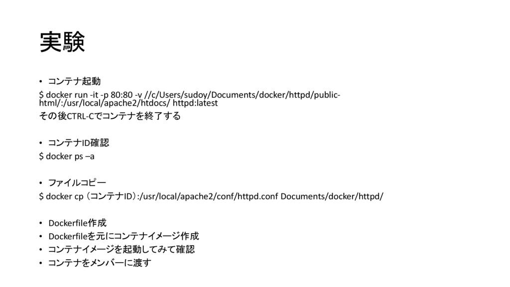 //c/Users/sudoy/Documents/docker/httpd/public- html/:/usr/local/apache2/htdocs/ httpd:latest その後CTRL-Cでコンテナを終了する • コンテナID確認 $ docker ps –a • ファイルコピー $ docker cp (コンテナID):/usr/local/apache2/conf/httpd.conf Documents/docker/httpd/ • Dockerfile作成 • Dockerfileを元にコンテナイメージ作成 • コンテナイメージを起動してみて確認 • コンテナをメンバーに渡す