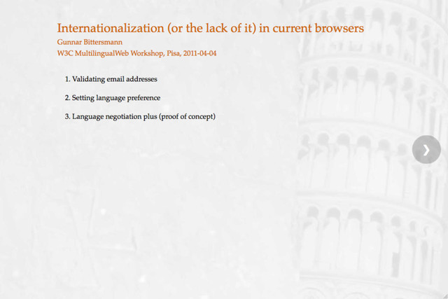 I’ll address two common i18n problems that users of current mainstream browsers face. Users should get content from multilingual Web sites automatically in a language they understand, hence they need a way to tell their preferences. Some browsers give users this option, but others don’t. I’ll demonstrate live if and how languages can be set in various browsers and discuss the usability issue that browser vendors have to deal with: the trade-off between functionality and a simple user interface. Users should also be able to enter email addresses with international domain names into forms. That might not be possible in modern browsers that already support HTML5’s new email input type. I’ll show how to validate email addresses not being too restrictive and eventually raise the question: Does the HTML5 specification have to be changed to reflect the users’ needs?