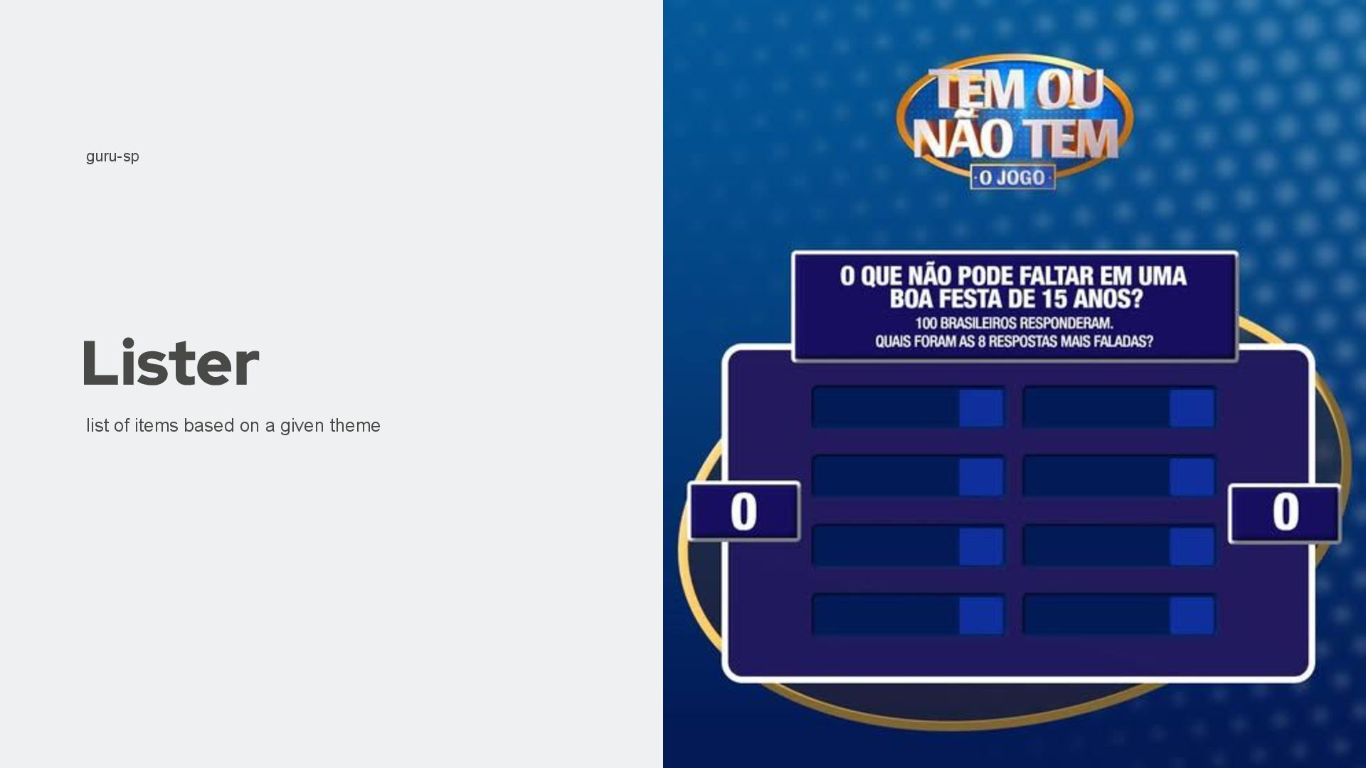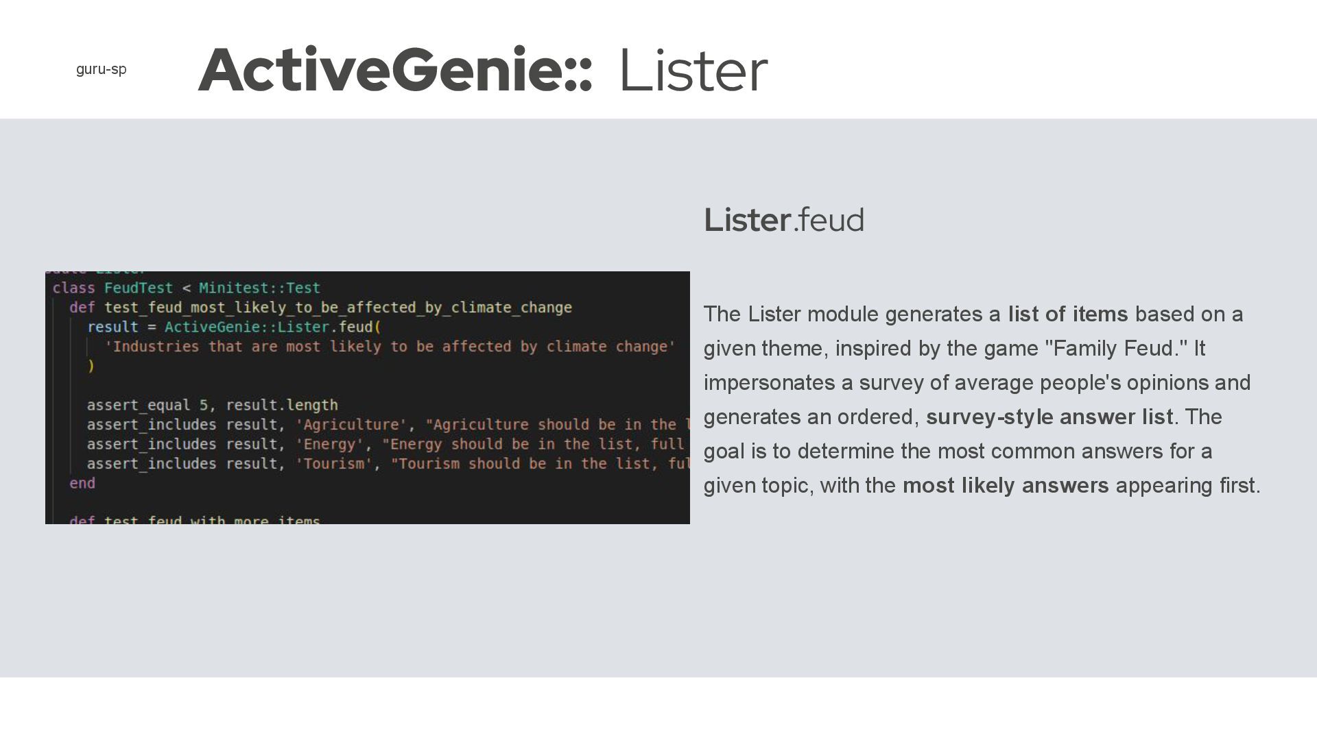 on a given theme, inspired by the game "Family Feud." It impersonates a survey of average people's opinions and generates an ordered, survey-style answer list. The goal is to determine the most common answers for a given topic, with the most likely answers appearing first. guru-sp ActiveGenie:: Lister