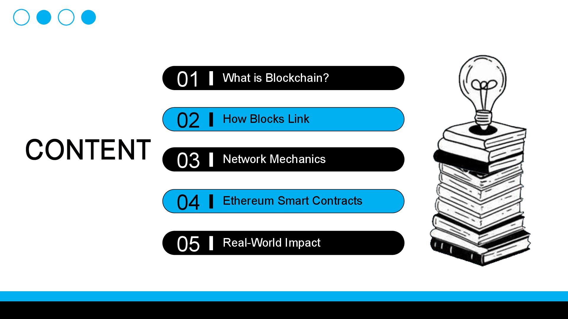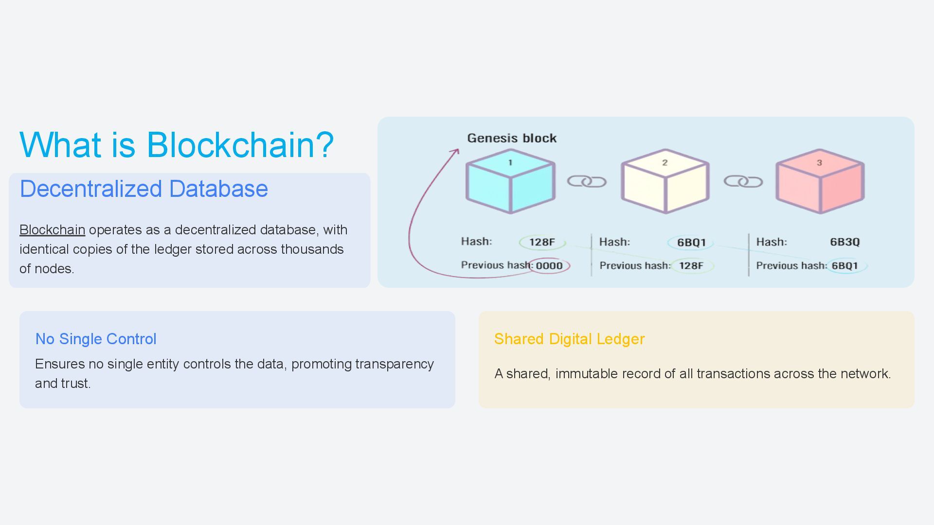 database, with identical copies of the ledger stored across thousands of nodes. No Single Control Ensures no single entity controls the data, promoting transparency and trust. Shared Digital Ledger A shared, immutable record of all transactions across the network.