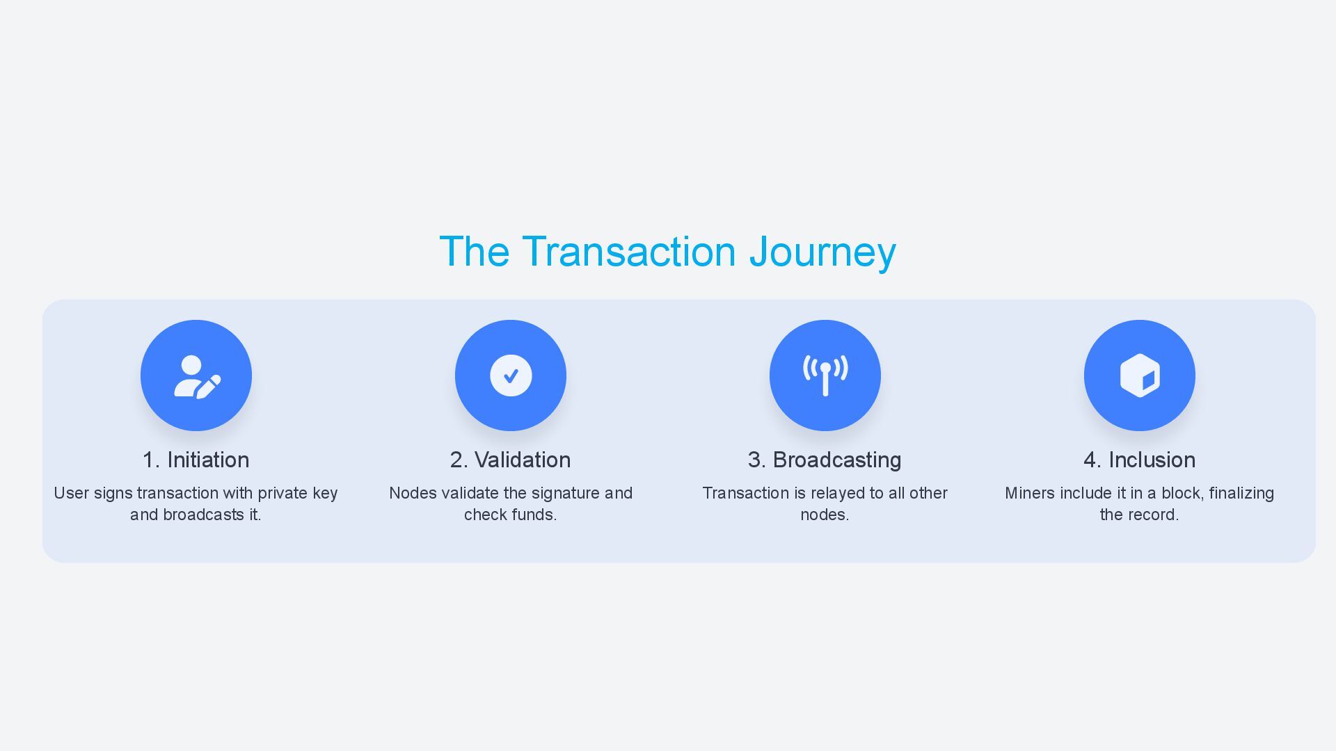 key and broadcasts it. 2. Validation Nodes validate the signature and check funds. 3. Broadcasting Transaction is relayed to all other nodes. 4. Inclusion Miners include it in a block, finalizing the record.