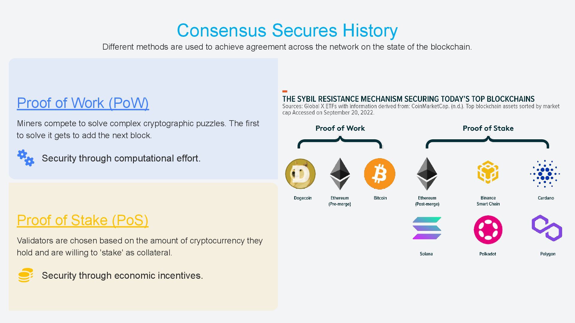 across the network on the state of the blockchain. Proof of Work (PoW) Miners compete to solve complex cryptographic puzzles. The first to solve it gets to add the next block. Security through computational effort. Proof of Stake (PoS) Validators are chosen based on the amount of cryptocurrency they hold and are willing to 'stake' as collateral. Security through economic incentives.