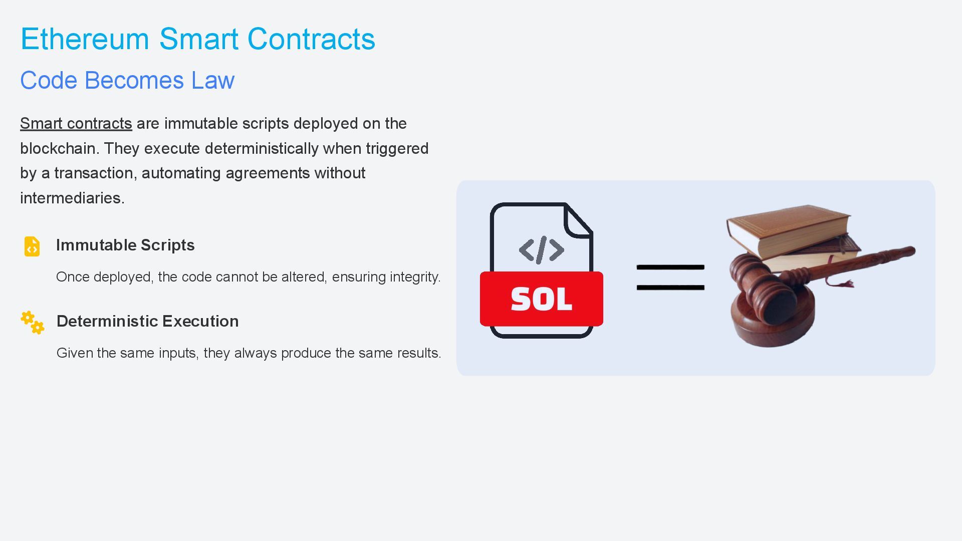 scripts deployed on the blockchain. They execute deterministically when triggered by a transaction, automating agreements without intermediaries. Immutable Scripts Once deployed, the code cannot be altered, ensuring integrity. Deterministic Execution Given the same inputs, they always produce the same results.