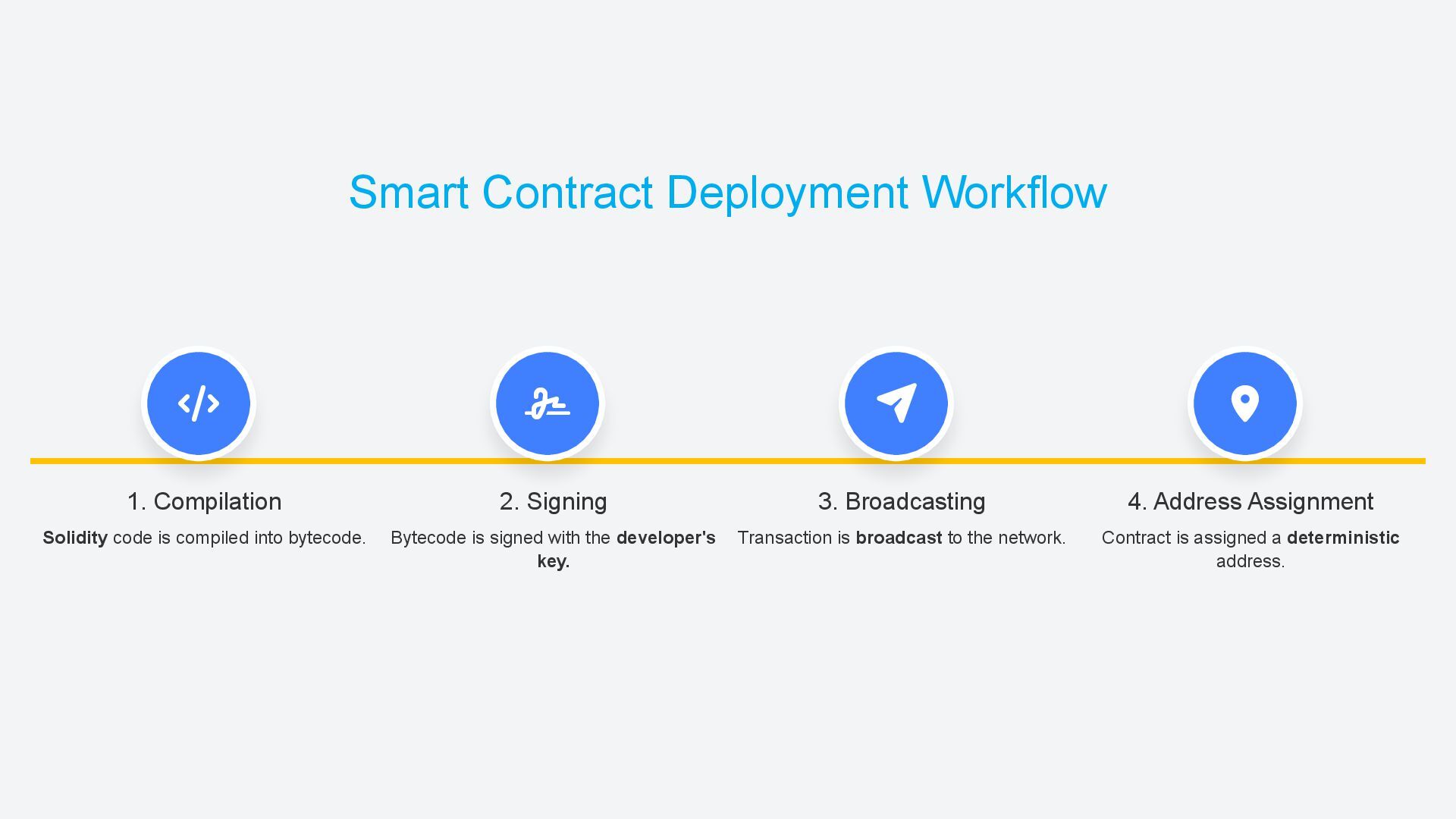 into bytecode. 2. Signing Bytecode is signed with the developer's key. 3. Broadcasting Transaction is broadcast to the network. 4. Address Assignment Contract is assigned a deterministic address.