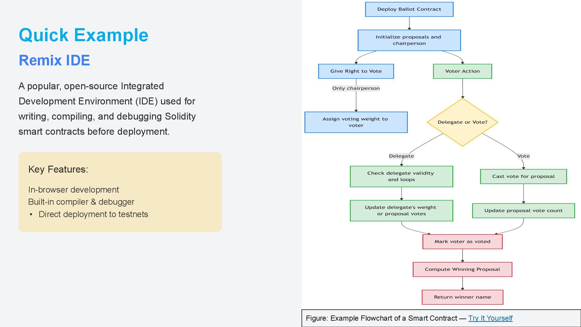 (IDE) used for writing, compiling, and debugging Solidity smart contracts before deployment. Key Features: In-browser development Built-in compiler & debugger • Direct deployment to testnets Figure: Example Flowchart of a Smart Contract — Try It Yourself