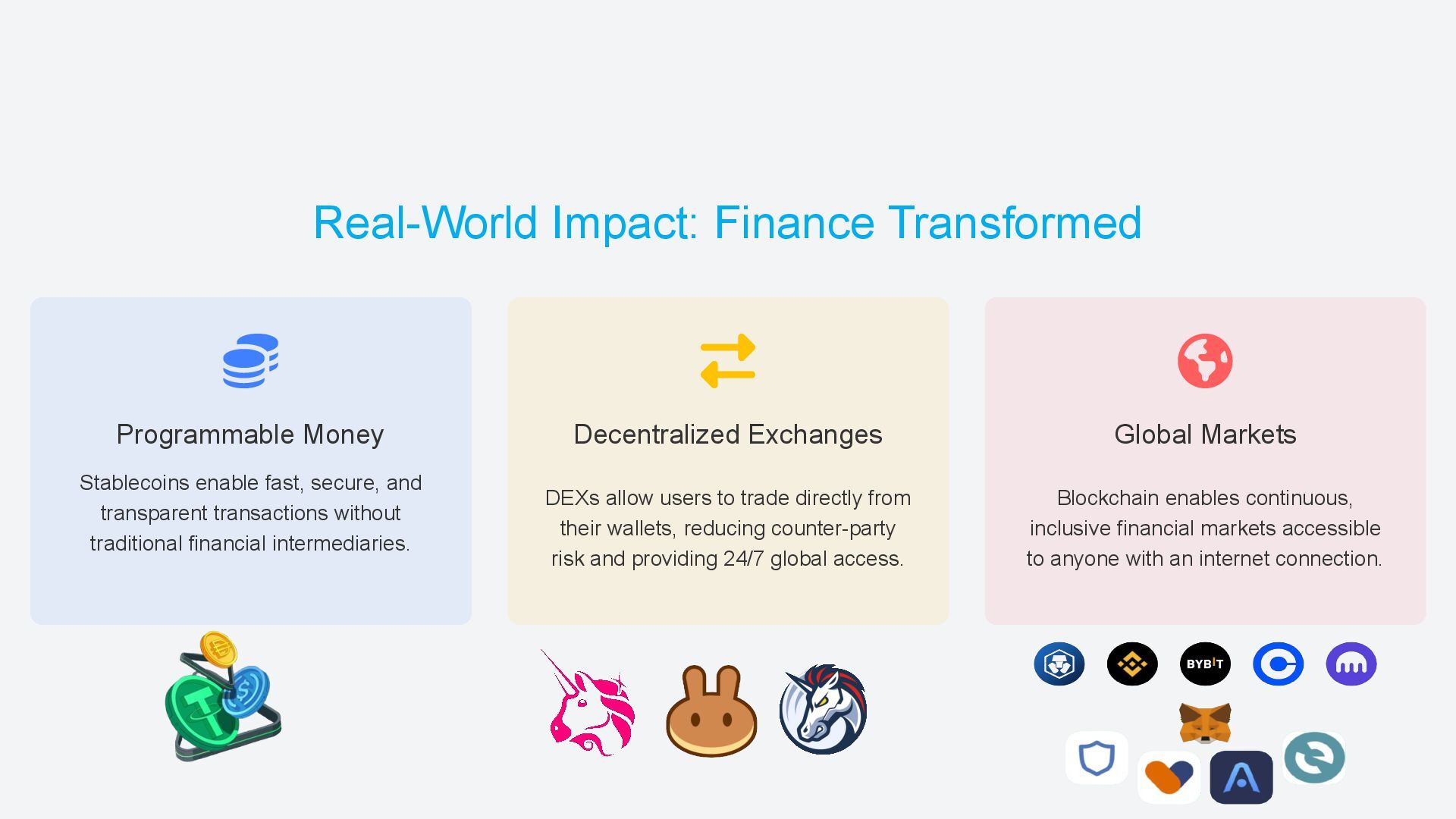 and transparent transactions without traditional financial intermediaries. Decentralized Exchanges DEXs allow users to trade directly from their wallets, reducing counter-party risk and providing 24/7 global access. Global Markets Blockchain enables continuous, inclusive financial markets accessible to anyone with an internet connection.