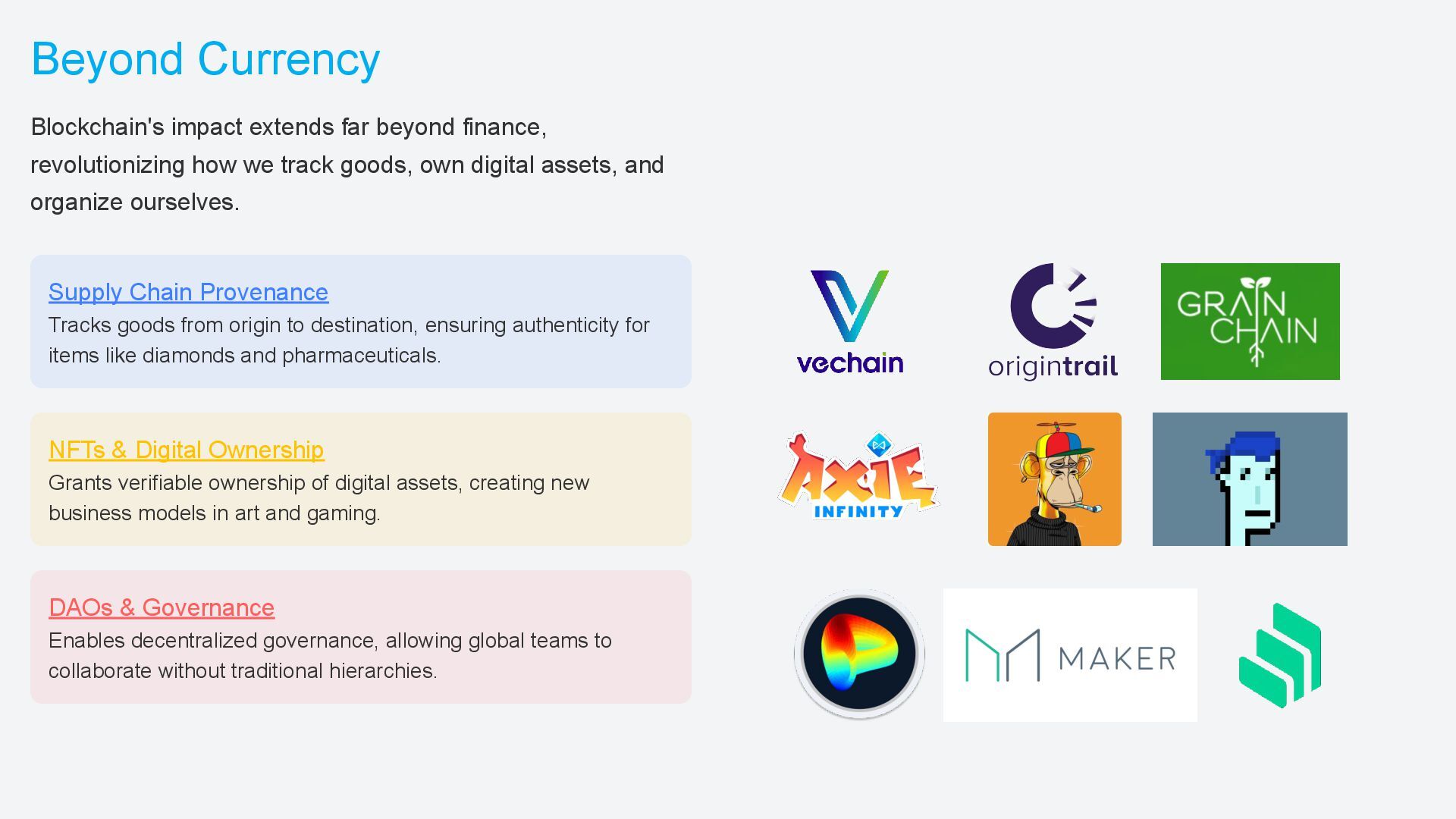 we track goods, own digital assets, and organize ourselves. Supply Chain Provenance Tracks goods from origin to destination, ensuring authenticity for items like diamonds and pharmaceuticals. NFTs & Digital Ownership Grants verifiable ownership of digital assets, creating new business models in art and gaming. DAOs & Governance Enables decentralized governance, allowing global teams to collaborate without traditional hierarchies.