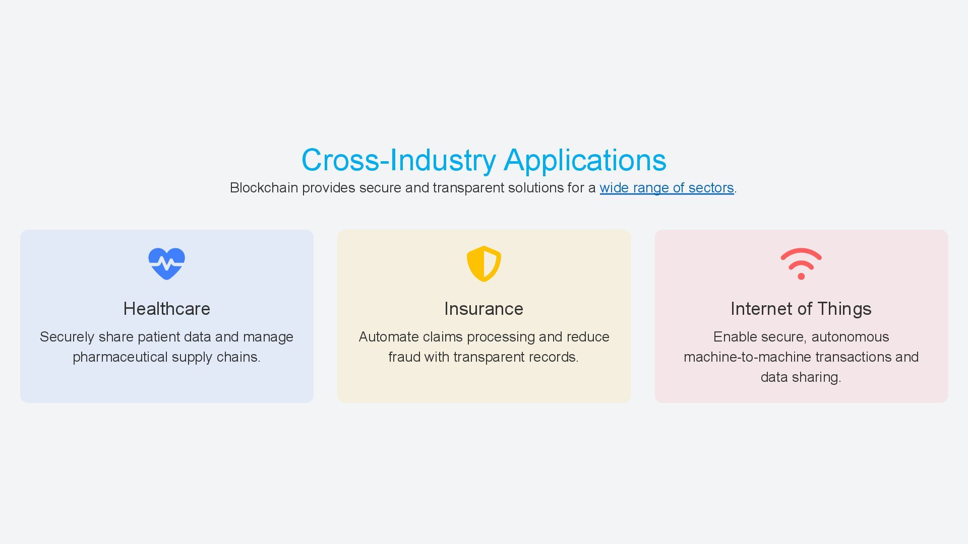 wide range of sectors. Healthcare Securely share patient data and manage pharmaceutical supply chains. Insurance Automate claims processing and reduce fraud with transparent records. Internet of Things Enable secure, autonomous machine-to-machine transactions and data sharing.