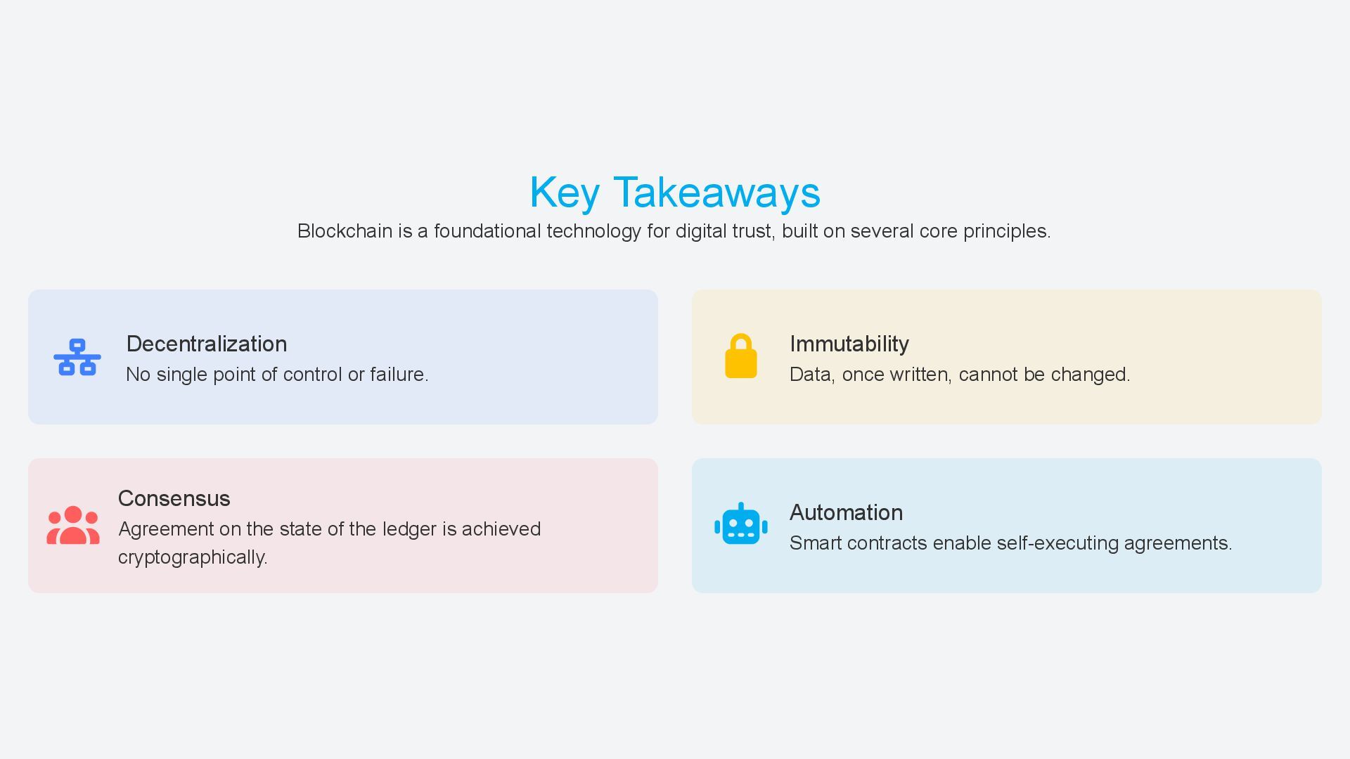 built on several core principles. Decentralization No single point of control or failure. Immutability Data, once written, cannot be changed. Consensus Agreement on the state of the ledger is achieved cryptographically. Automation Smart contracts enable self-executing agreements.