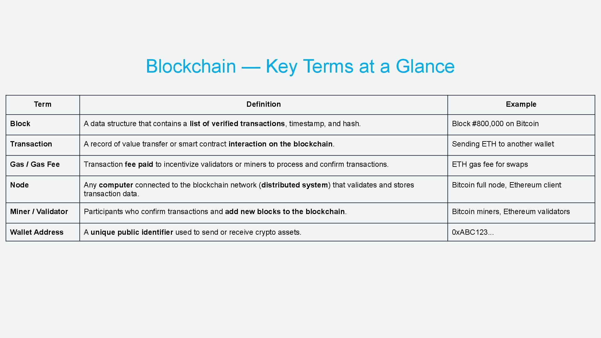 Block A data structure that contains a list of verified transactions, timestamp, and hash. Block #800,000 on Bitcoin Transaction A record of value transfer or smart contract interaction on the blockchain. Sending ETH to another wallet Gas / Gas Fee Transaction fee paid to incentivize validators or miners to process and confirm transactions. ETH gas fee for swaps Node Any computer connected to the blockchain network (distributed system) that validates and stores transaction data. Bitcoin full node, Ethereum client Miner / Validator Participants who confirm transactions and add new blocks to the blockchain. Bitcoin miners, Ethereum validators Wallet Address A unique public identifier used to send or receive crypto assets. 0xABC123...