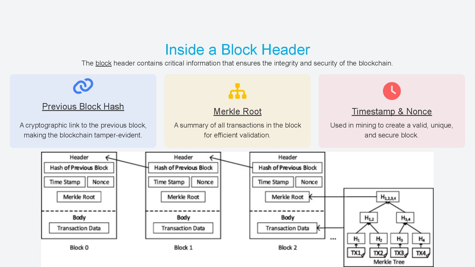 that ensures the integrity and security of the blockchain. Previous Block Hash A cryptographic link to the previous block, making the blockchain tamper-evident. Merkle Root A summary of all transactions in the block for efficient validation. Timestamp & Nonce Used in mining to create a valid, unique, and secure block.
