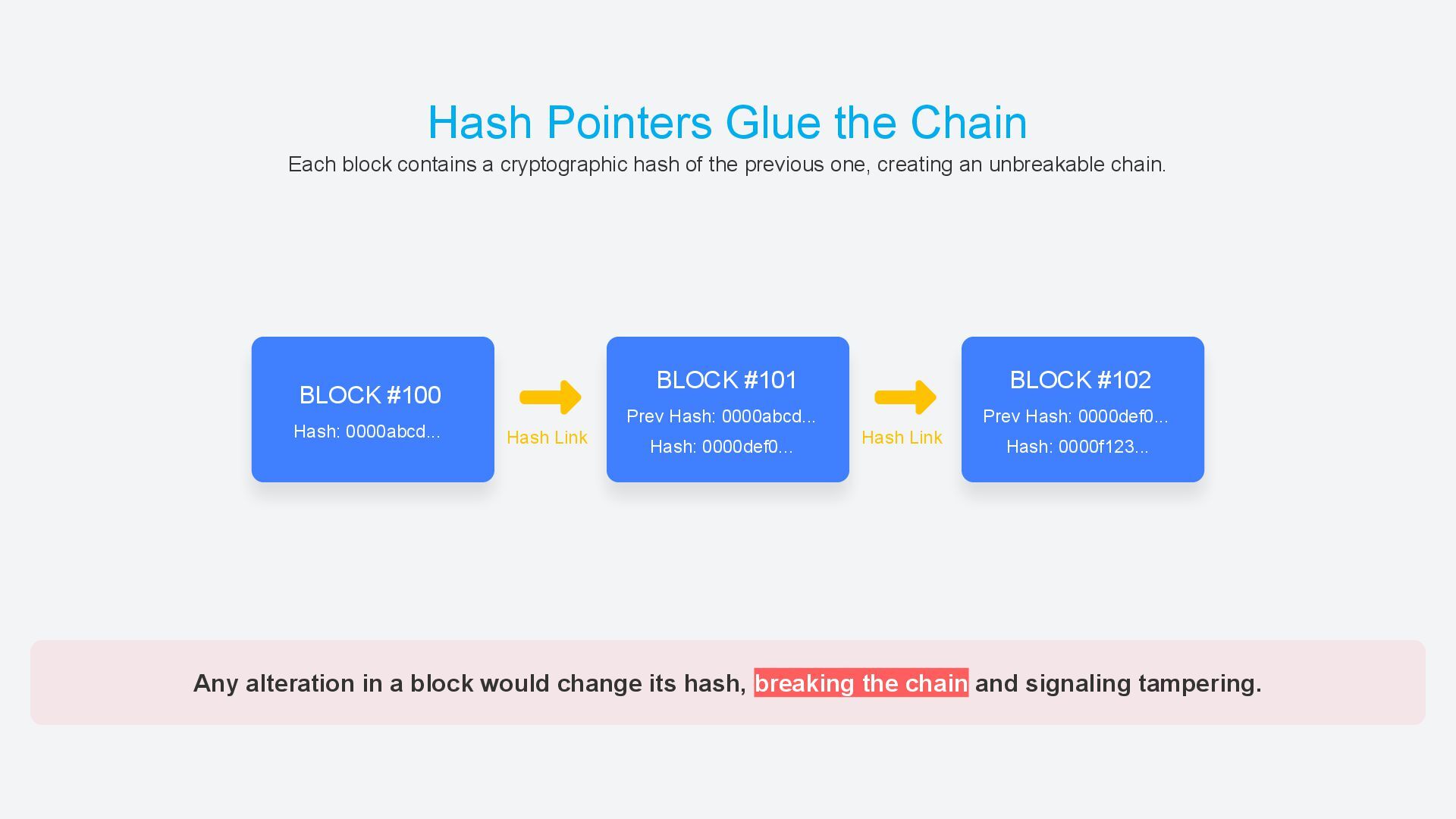 hash of the previous one, creating an unbreakable chain. BLOCK #100 Hash: 0000abcd... Hash Link BLOCK #101 Prev Hash: 0000abcd... Hash: 0000def0... Hash Link BLOCK #102 Prev Hash: 0000def0... Hash: 0000f123... Any alteration in a block would change its hash, breaking the chain and signaling tampering.