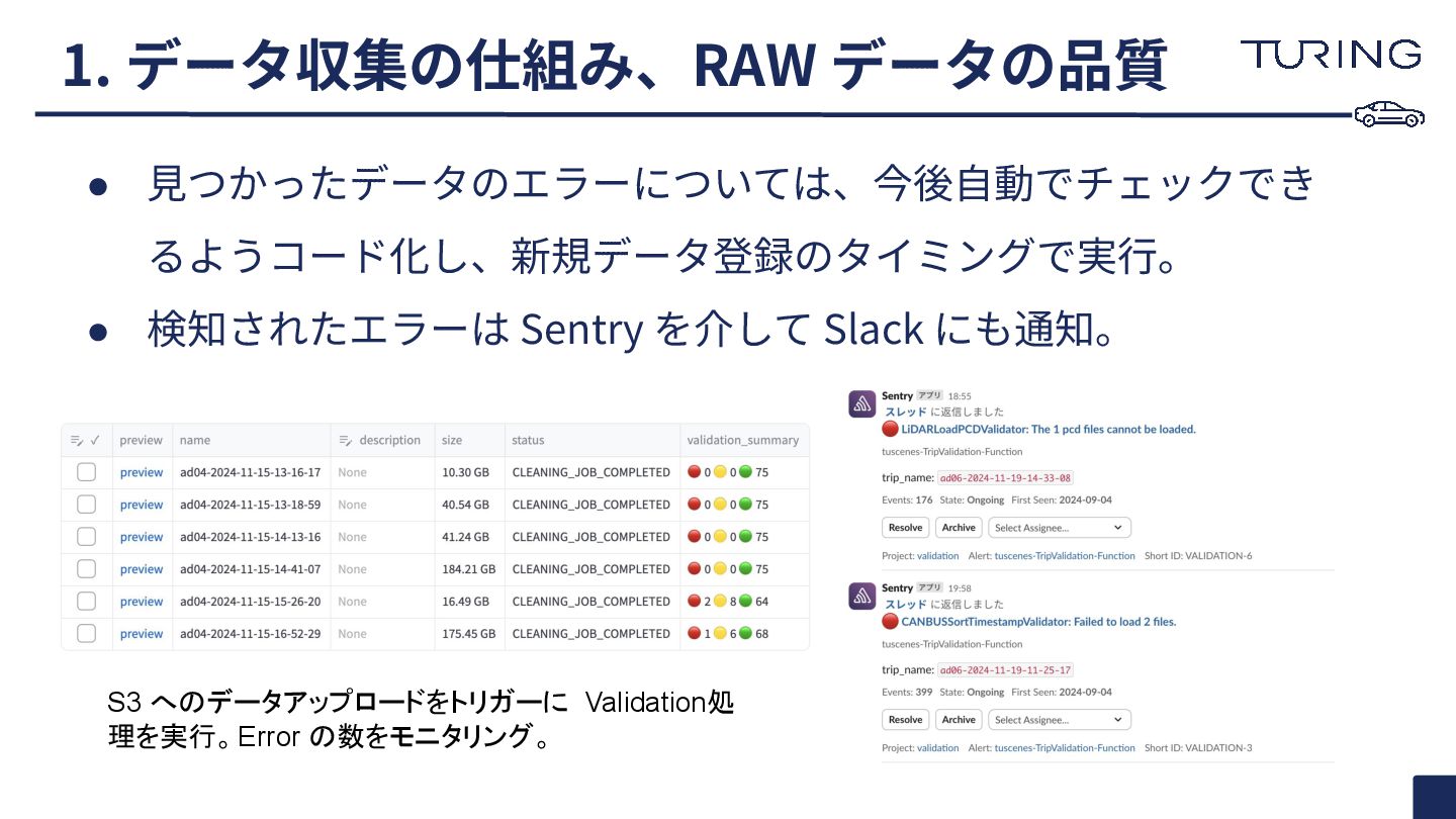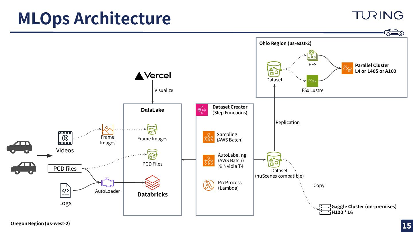 Creator (Step Functions) PCD files Sampling (AWS Batch) AutoLabeling (AWS Batch) ※ Nvidia T4 Dataset (nuScenes compatible) Parallel Cluster L4 or L40S or A100 Gaggle Cluster (on-premises) H100 * 16 15 AutoLoader Databricks Frame Images PCD Files Frame Images PreProcess (Lambda) FSx Lustre EFS Dataset Copy Replication Visualize Oregon Region (us-west-2)