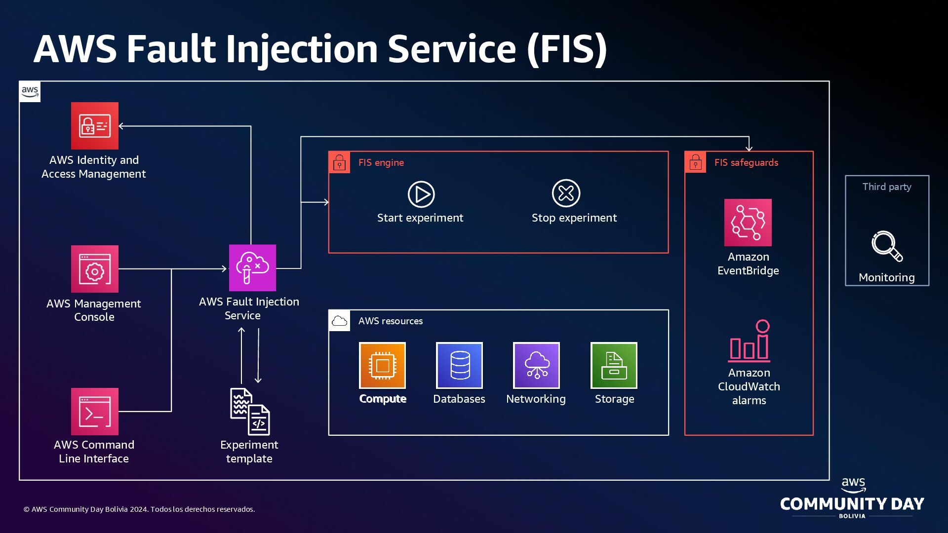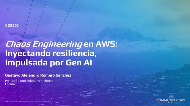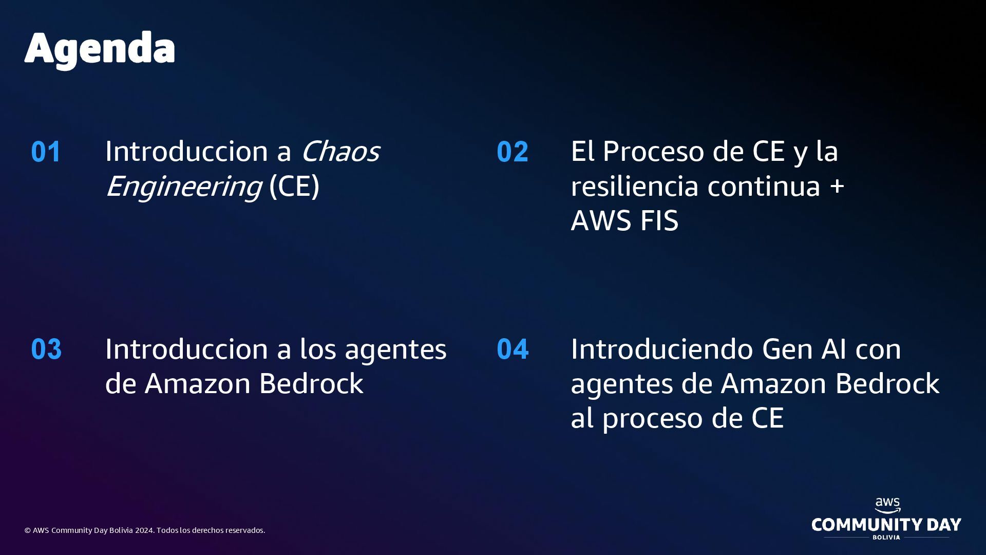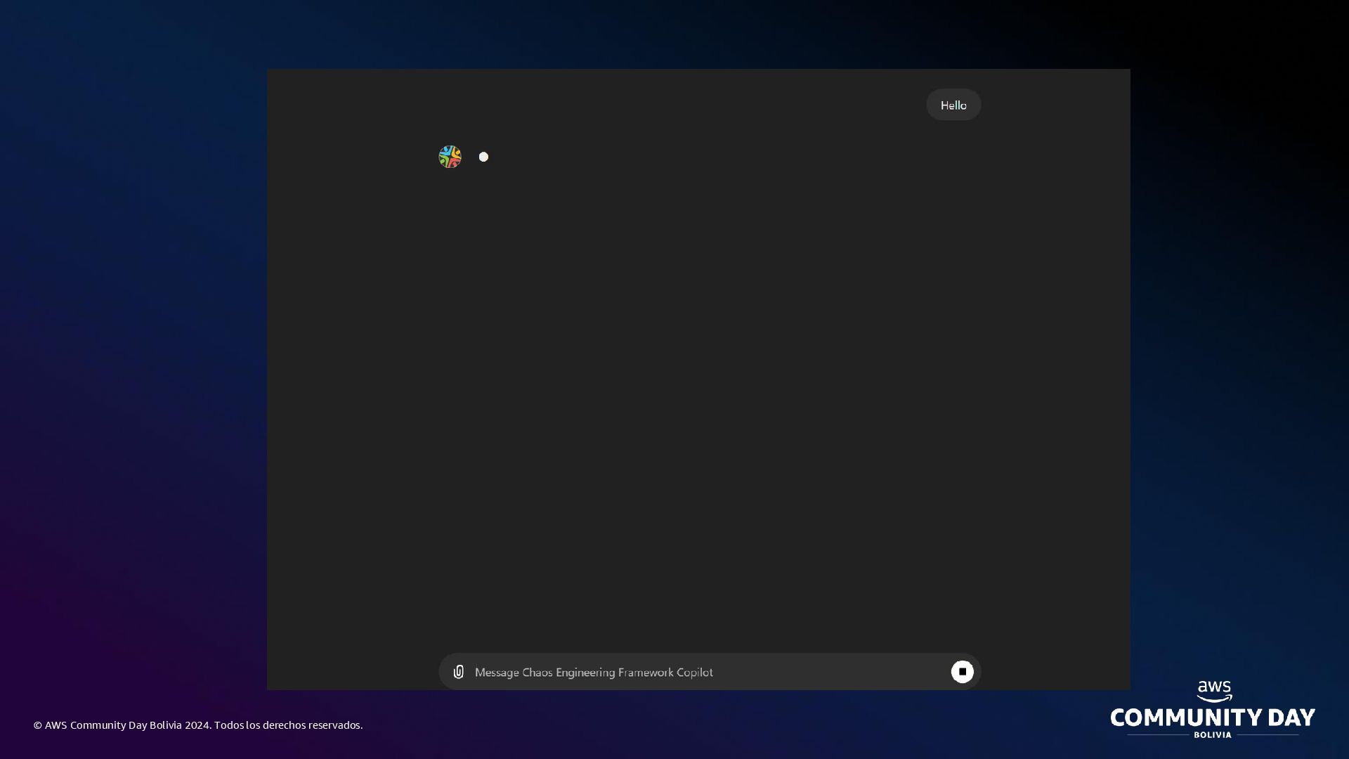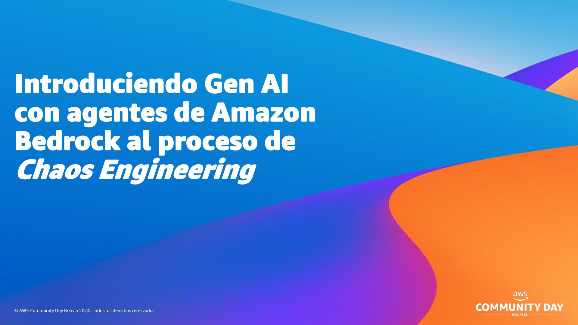 Presented at the AWS Community Day Bolivia 2024, where I introduced the Chaos Engineering process, walked through AWS Fault Injection Service experiment templates, and demonstrated how Amazon Bedrock–powered agents can automate resilience testing through a demo.