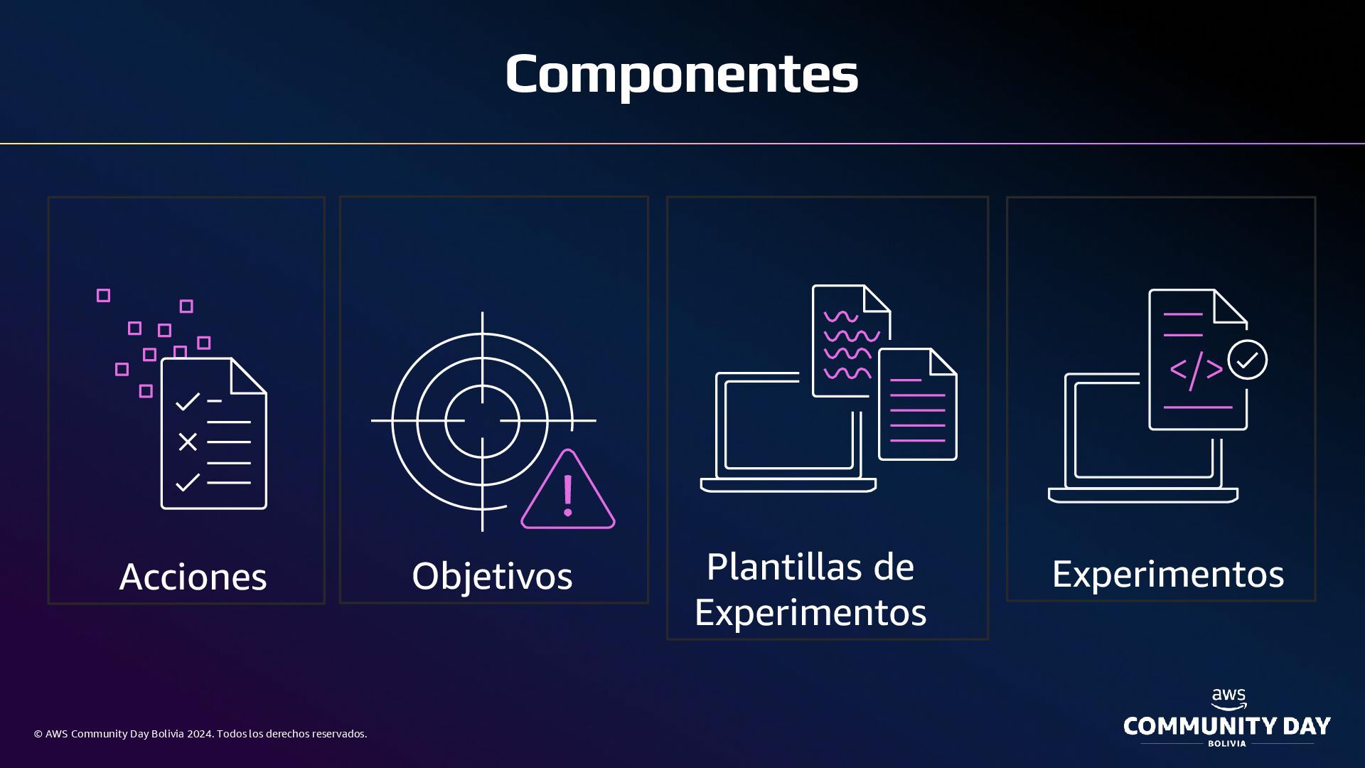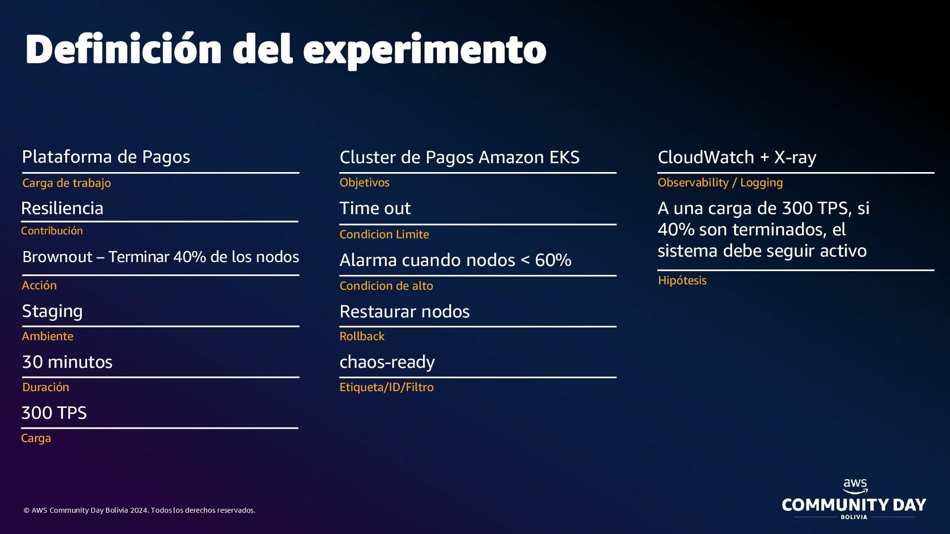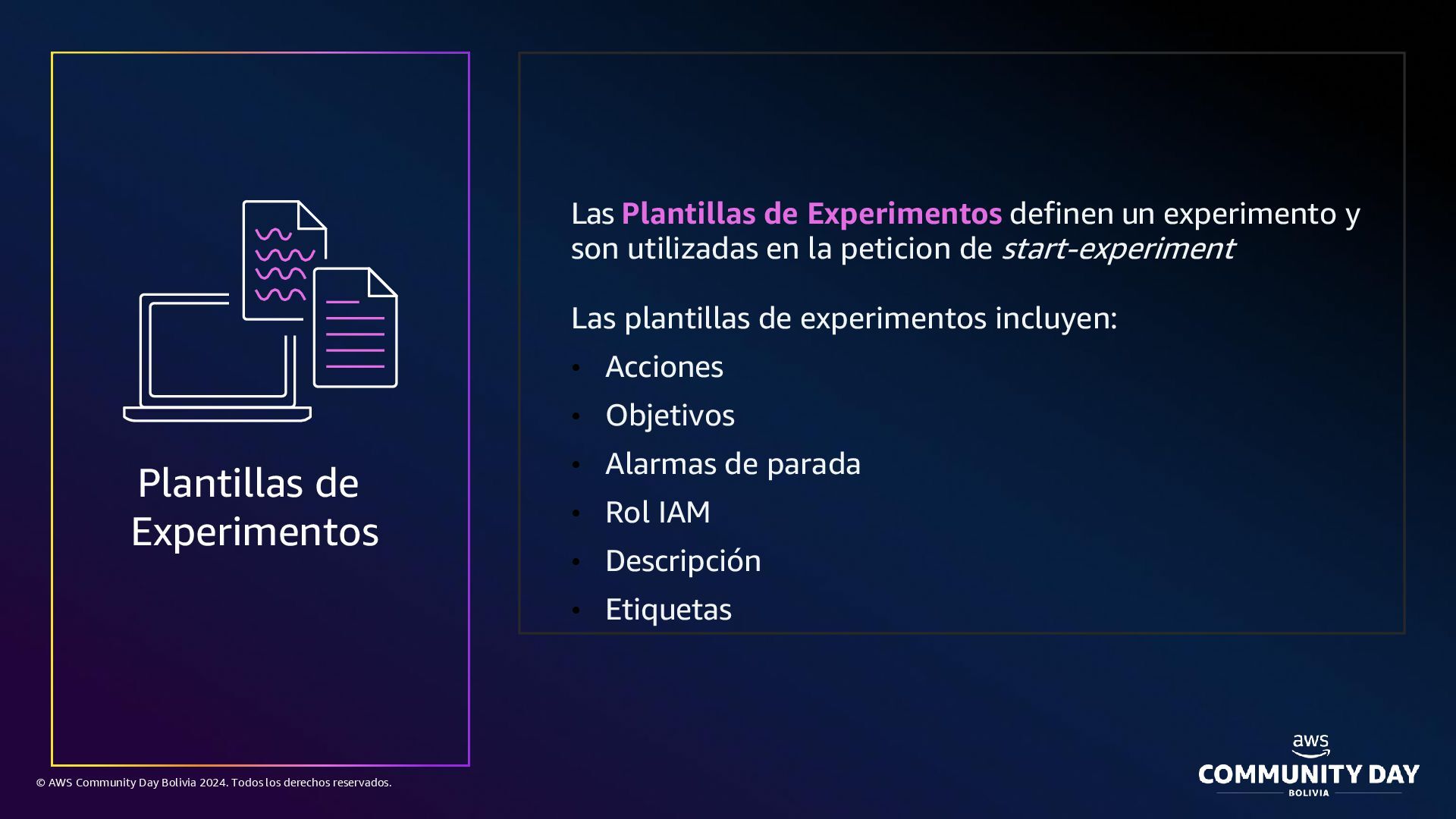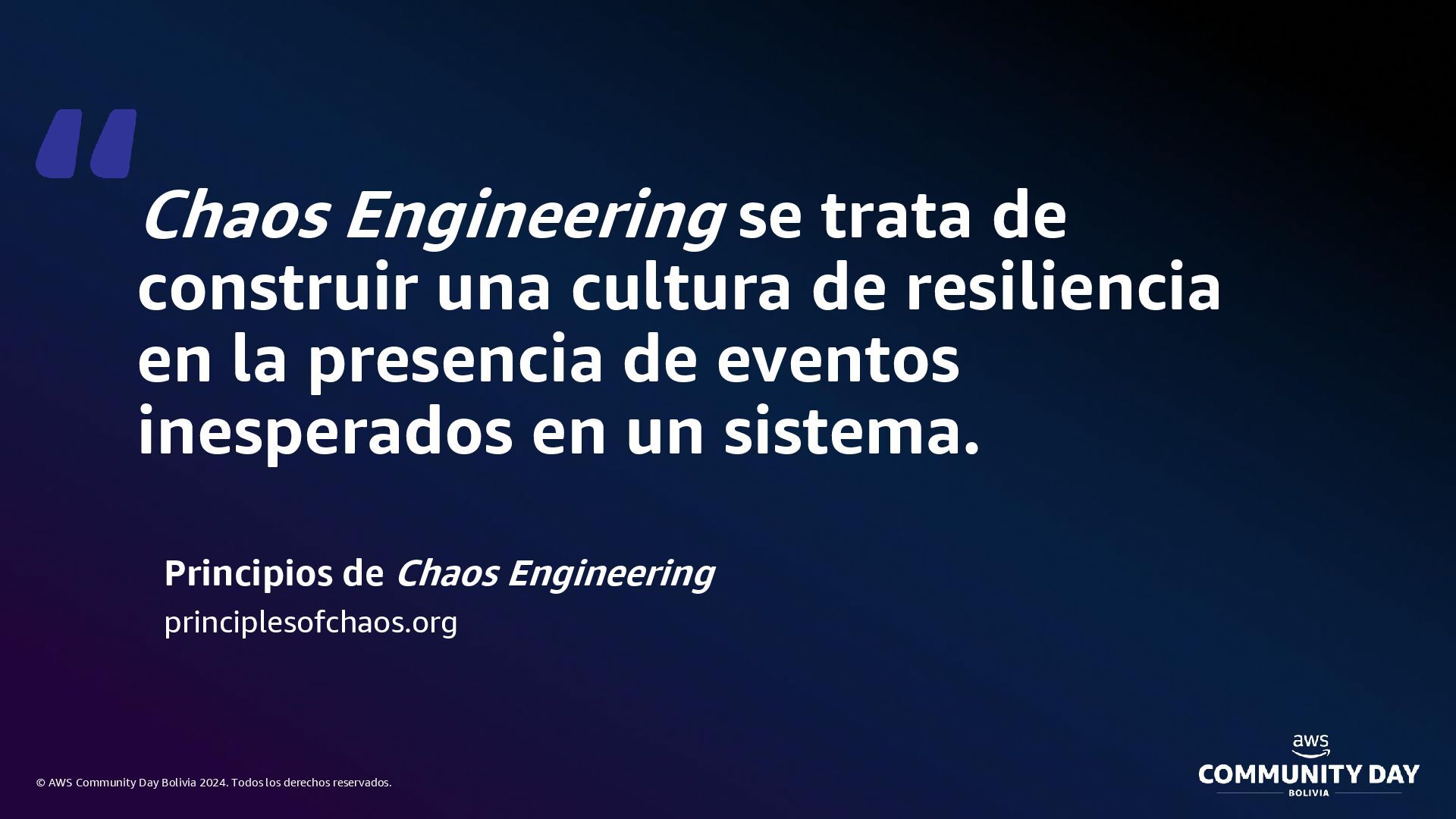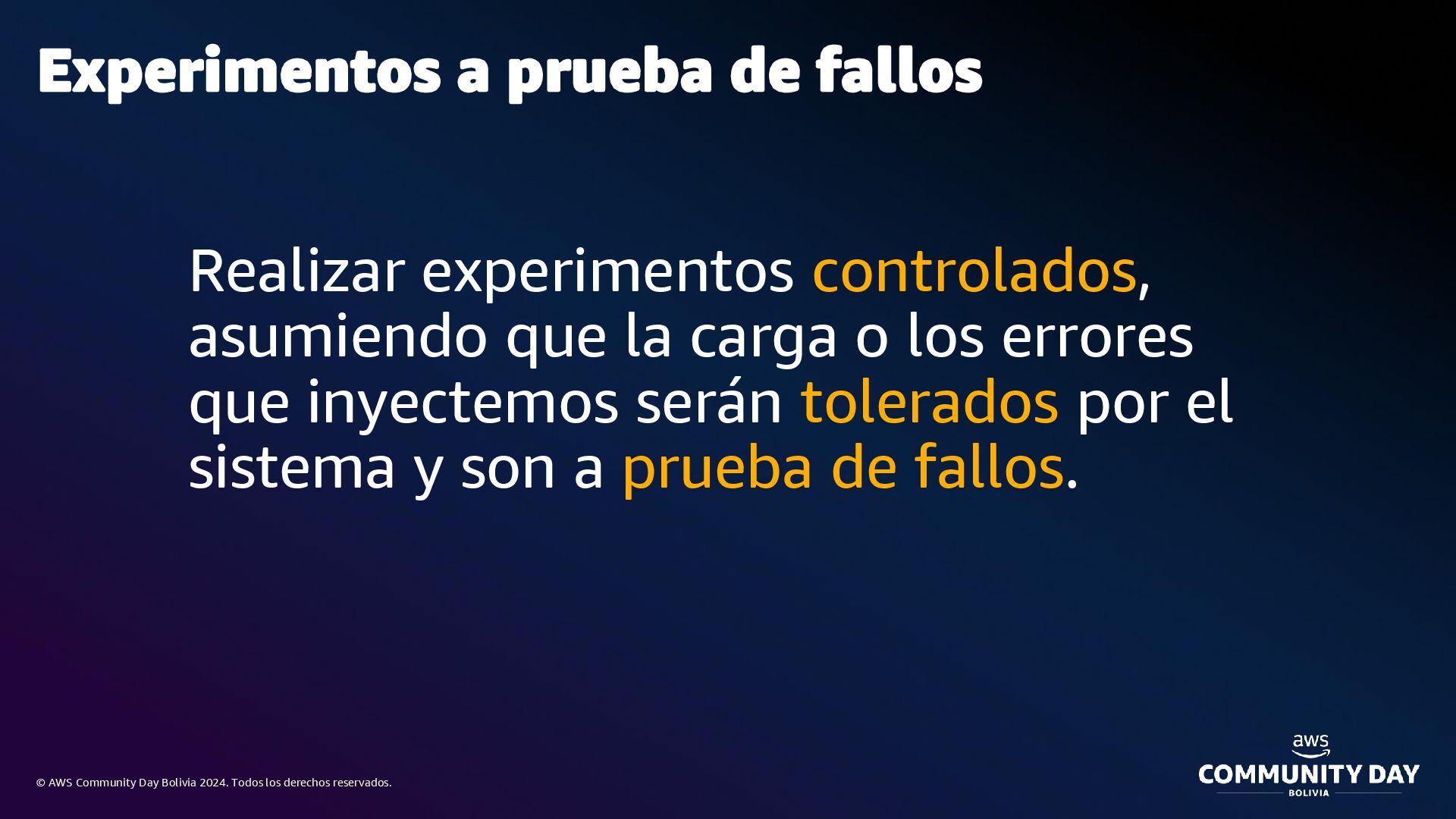 Presented at the AWS Community Day Bolivia 2024, where I introduced the Chaos Engineering process, walked through AWS Fault Injection Service experiment templates, and demonstrated how Amazon Bedrock–powered agents can automate resilience testing through a demo.