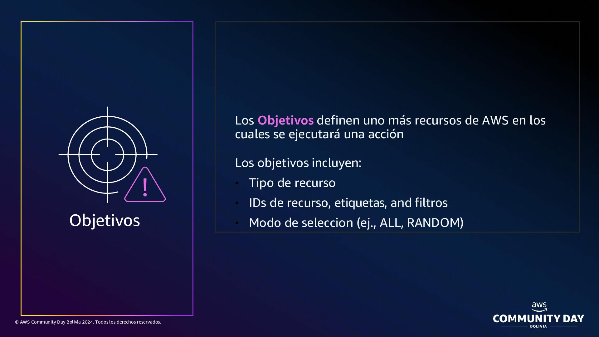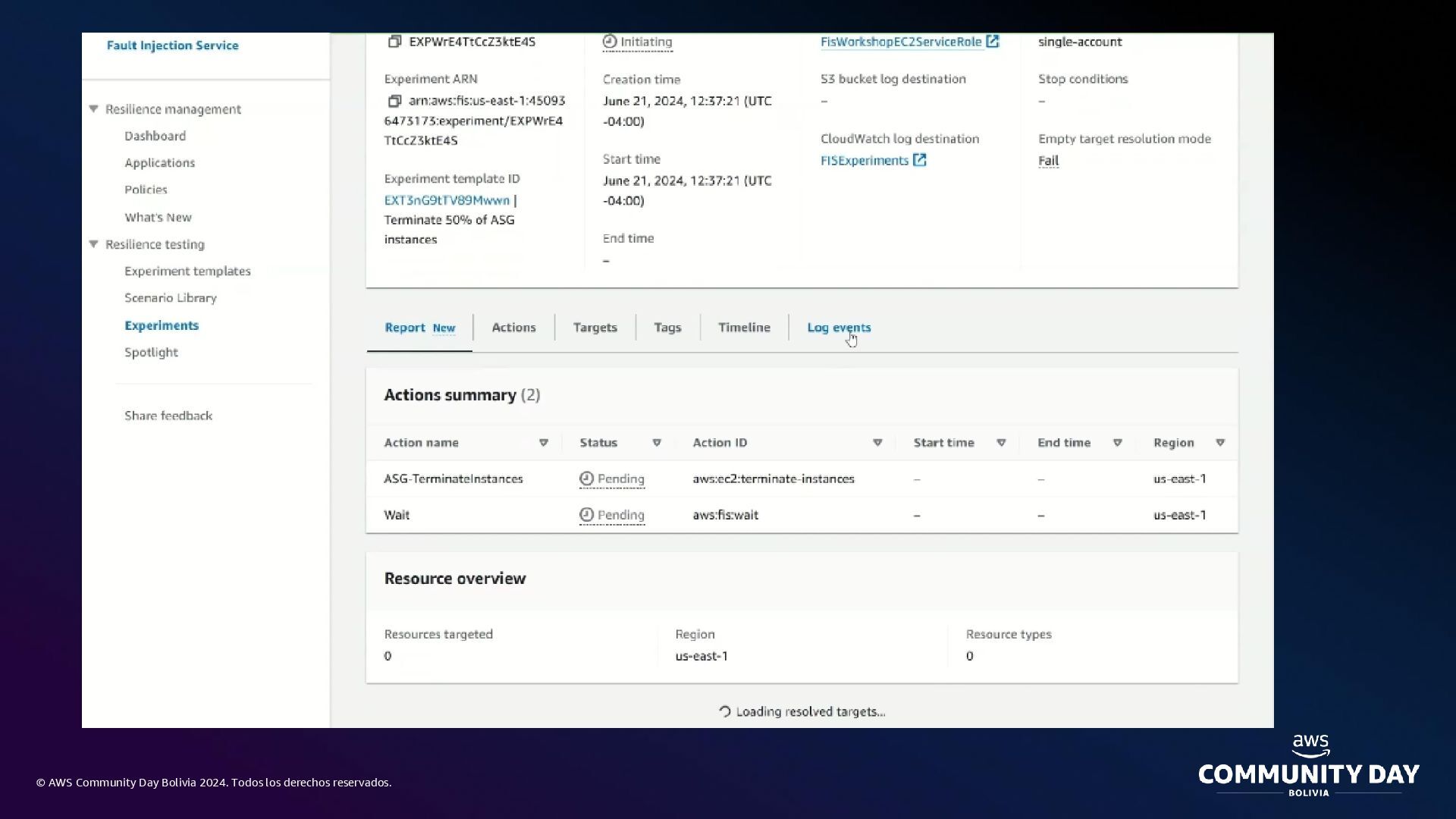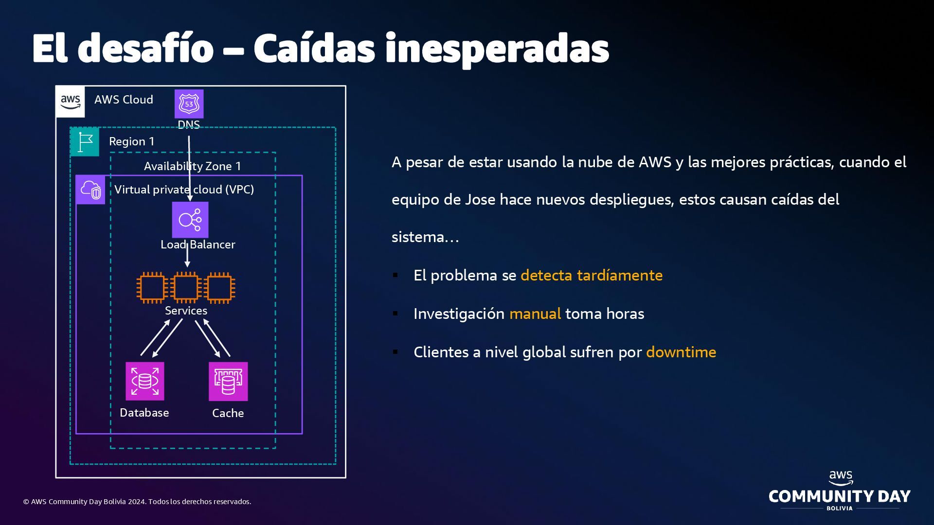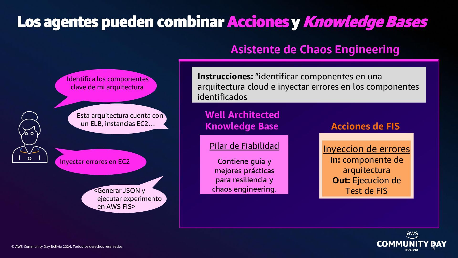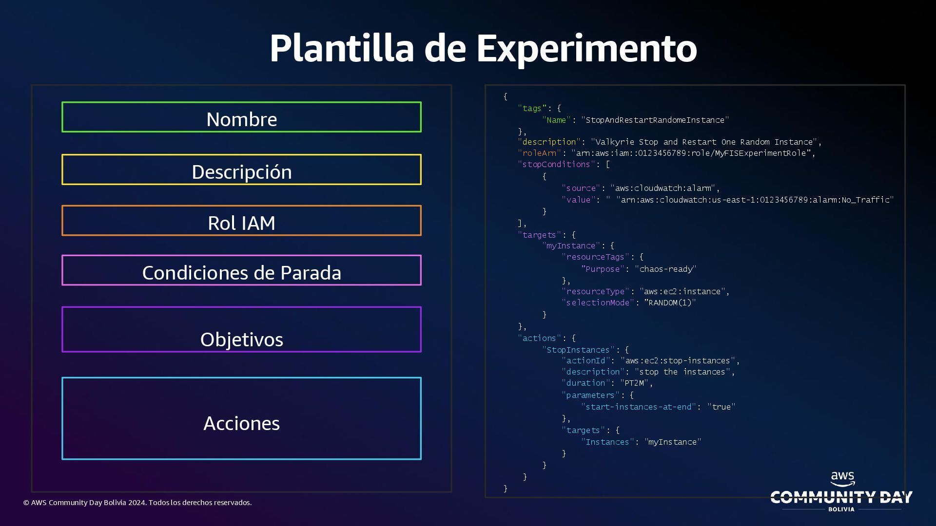 Presented at the AWS Community Day Bolivia 2024, where I introduced the Chaos Engineering process, walked through AWS Fault Injection Service experiment templates, and demonstrated how Amazon Bedrock–powered agents can automate resilience testing through a demo.