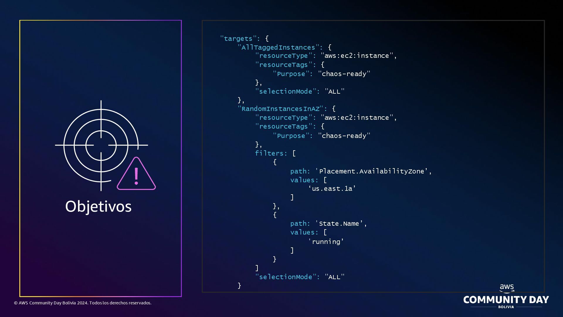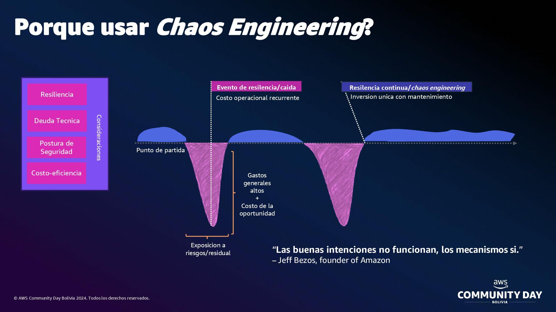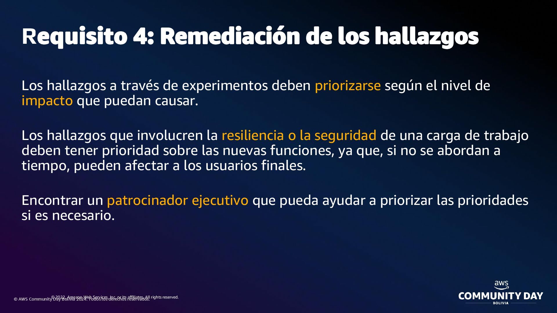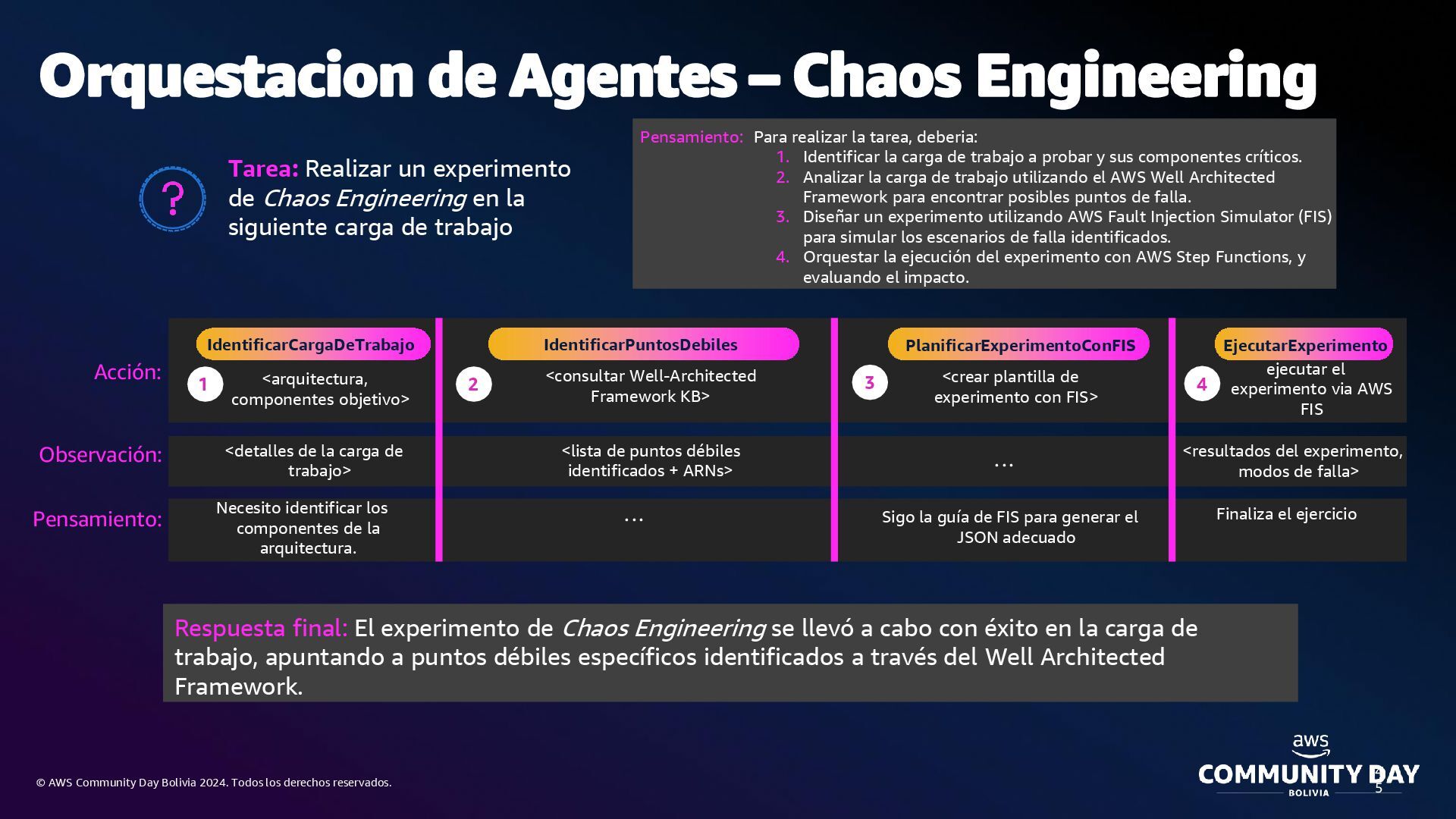 Presented at the AWS Community Day Bolivia 2024, where I introduced the Chaos Engineering process, walked through AWS Fault Injection Service experiment templates, and demonstrated how Amazon Bedrock–powered agents can automate resilience testing through a demo.