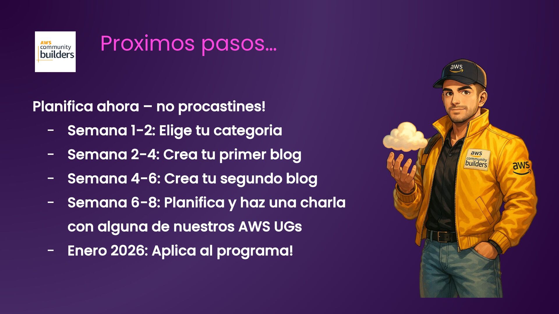 Elige tu categoria - Semana 2-4: Crea tu primer blog - Semana 4-6: Crea tu segundo blog - Semana 6-8: Planifica y haz una charla con alguna de nuestros AWS UGs - Enero 2026: Aplica al programa!