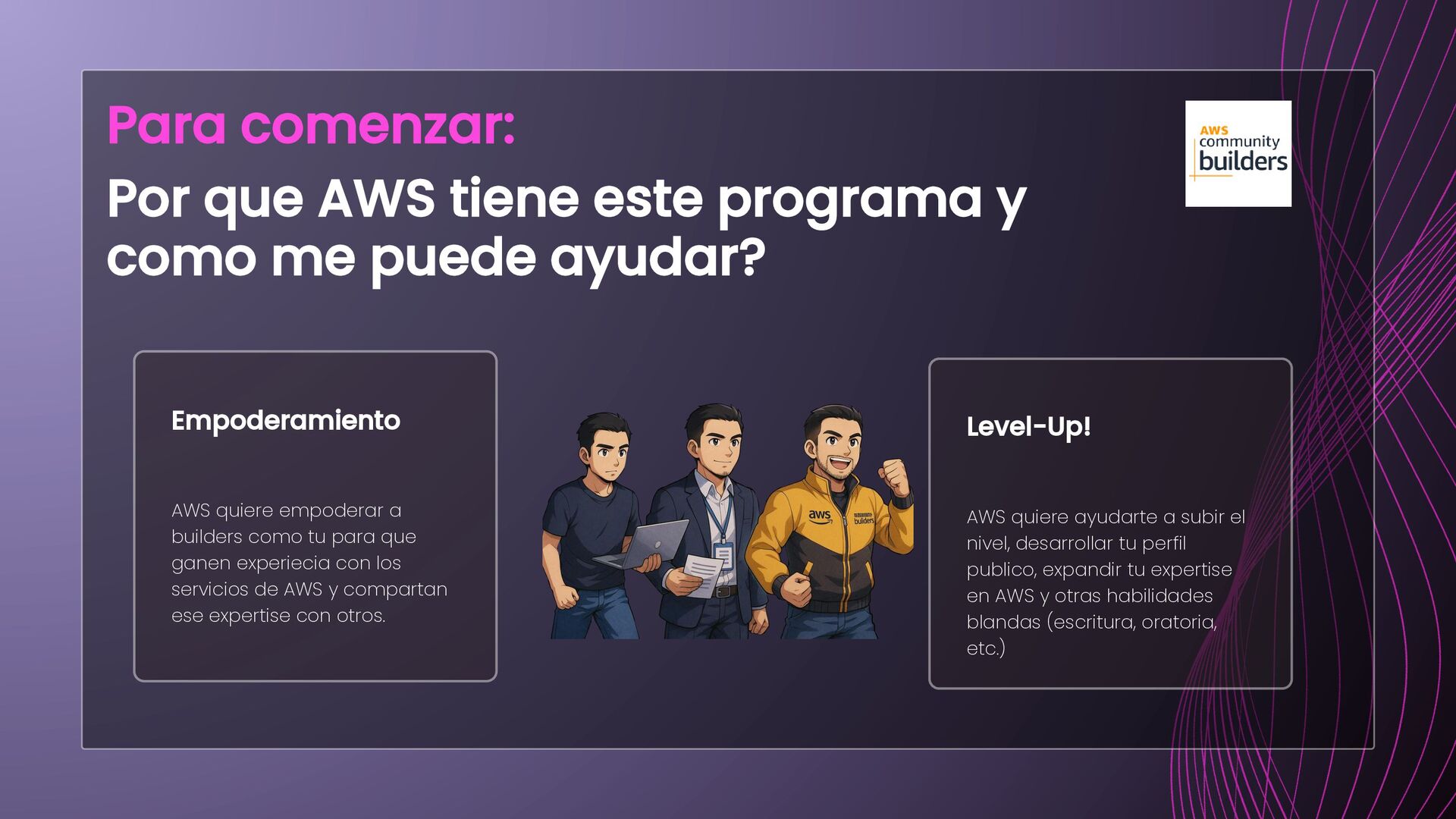 experiecia con los servicios de AWS y compartan ese expertise con otros. Empoderamiento Para comenzar: Por que AWS tiene este programa y como me puede ayudar? AWS quiere ayudarte a subir el nivel, desarrollar tu perfil publico, expandir tu expertise en AWS y otras habilidades blandas (escritura, oratoria, etc.) Level-Up!