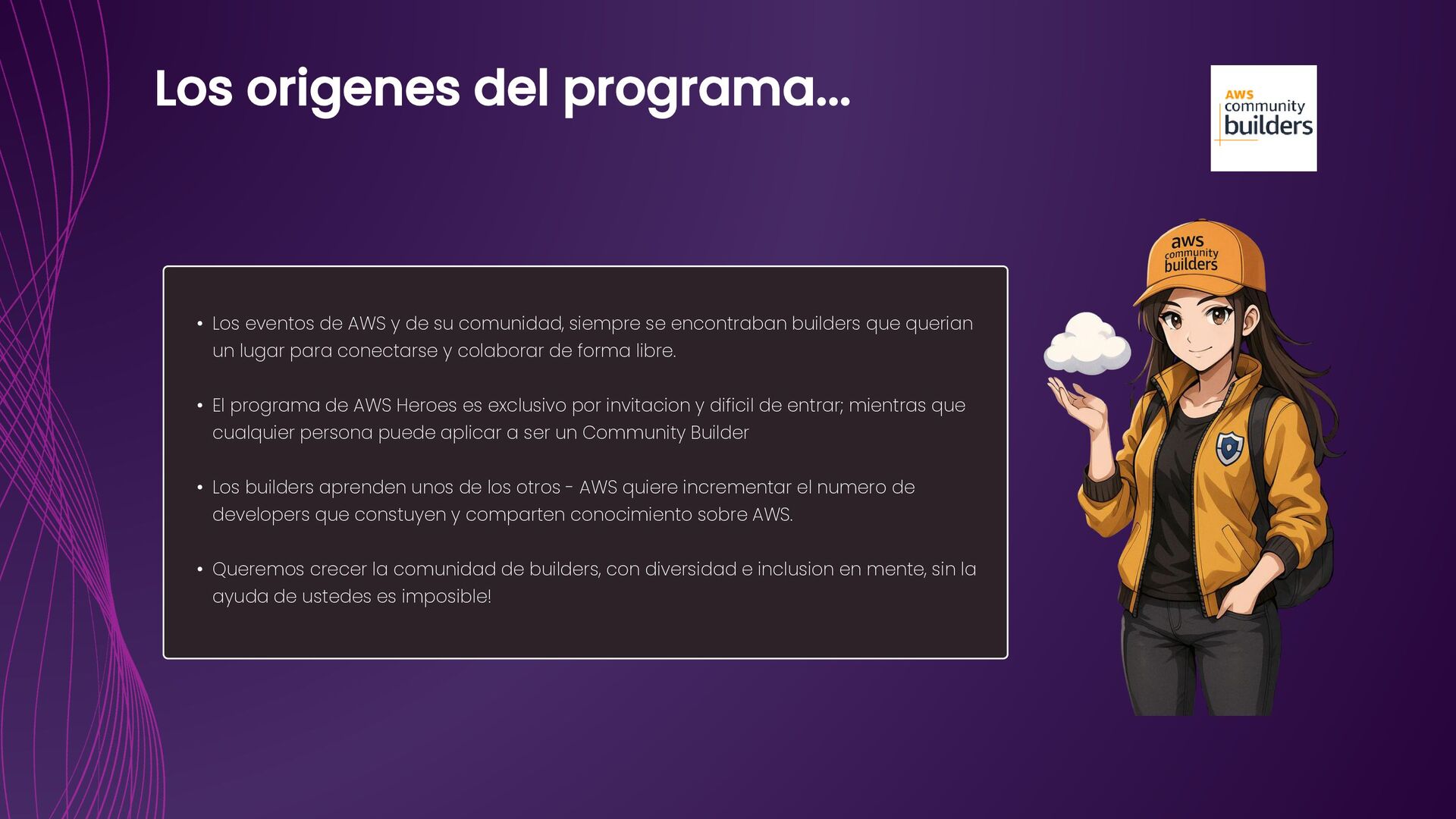 de su comunidad, siempre se encontraban builders que querian un lugar para conectarse y colaborar de forma libre. • El programa de AWS Heroes es exclusivo por invitacion y dificil de entrar; mientras que cualquier persona puede aplicar a ser un Community Builder • Los builders aprenden unos de los otros - AWS quiere incrementar el numero de developers que constuyen y comparten conocimiento sobre AWS. • Queremos crecer la comunidad de builders, con diversidad e inclusion en mente, sin la ayuda de ustedes es imposible!