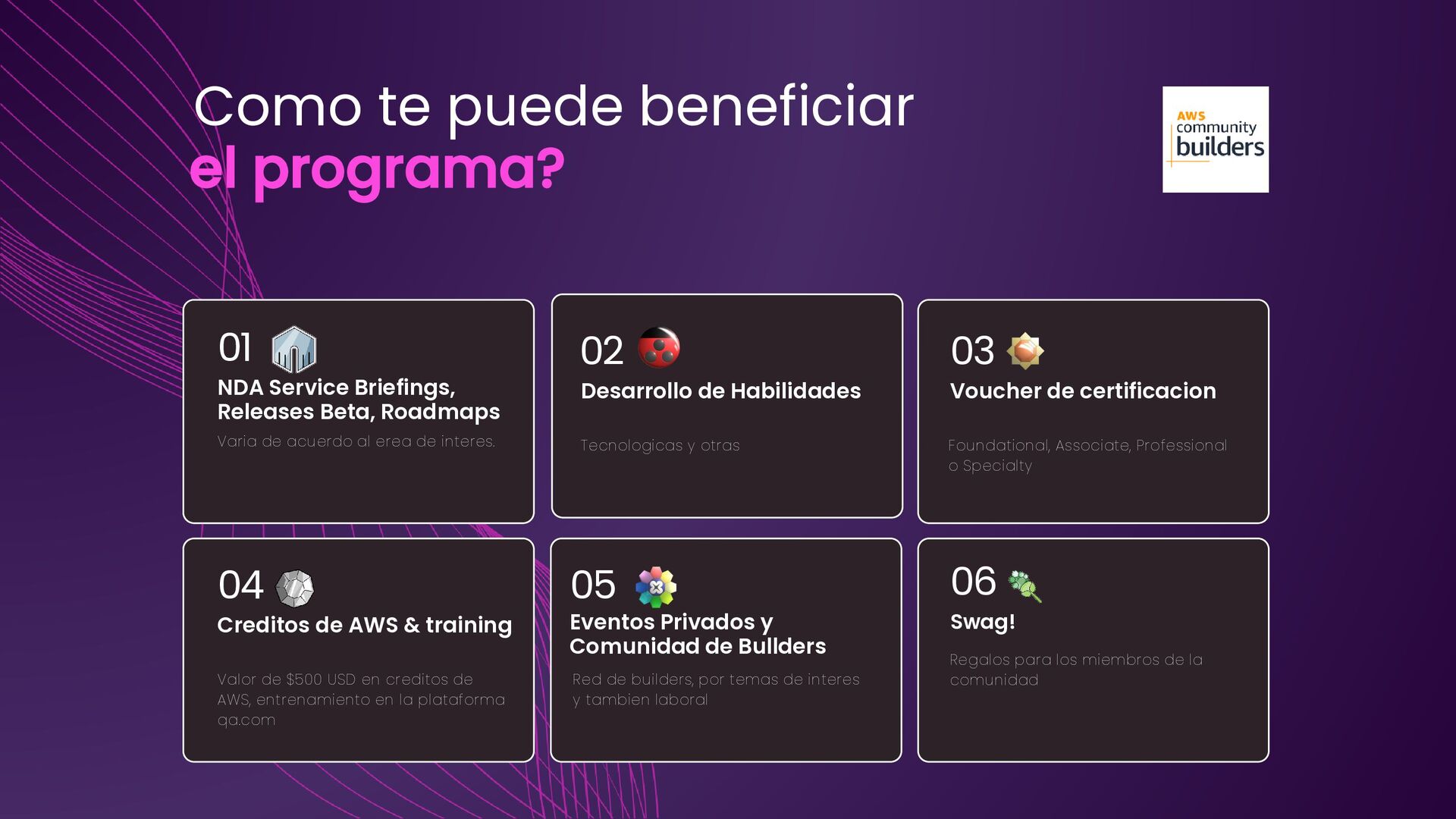 NDA Service Briefings, Releases Beta, Roadmaps Creditos de AWS & training Desarrollo de Habilidades Eventos Privados y Comunidad de Bullders Varia de acuerdo al erea de interes. Valor de $500 USD en creditos de AWS, entrenamiento en la plataforma qa.com Tecnologicas y otras Red de builders, por temas de interes y tambien laboral Voucher de certificacion Swag! Foundational, Associate, Professional o Specialty Regalos para los miembros de la comunidad 03 06