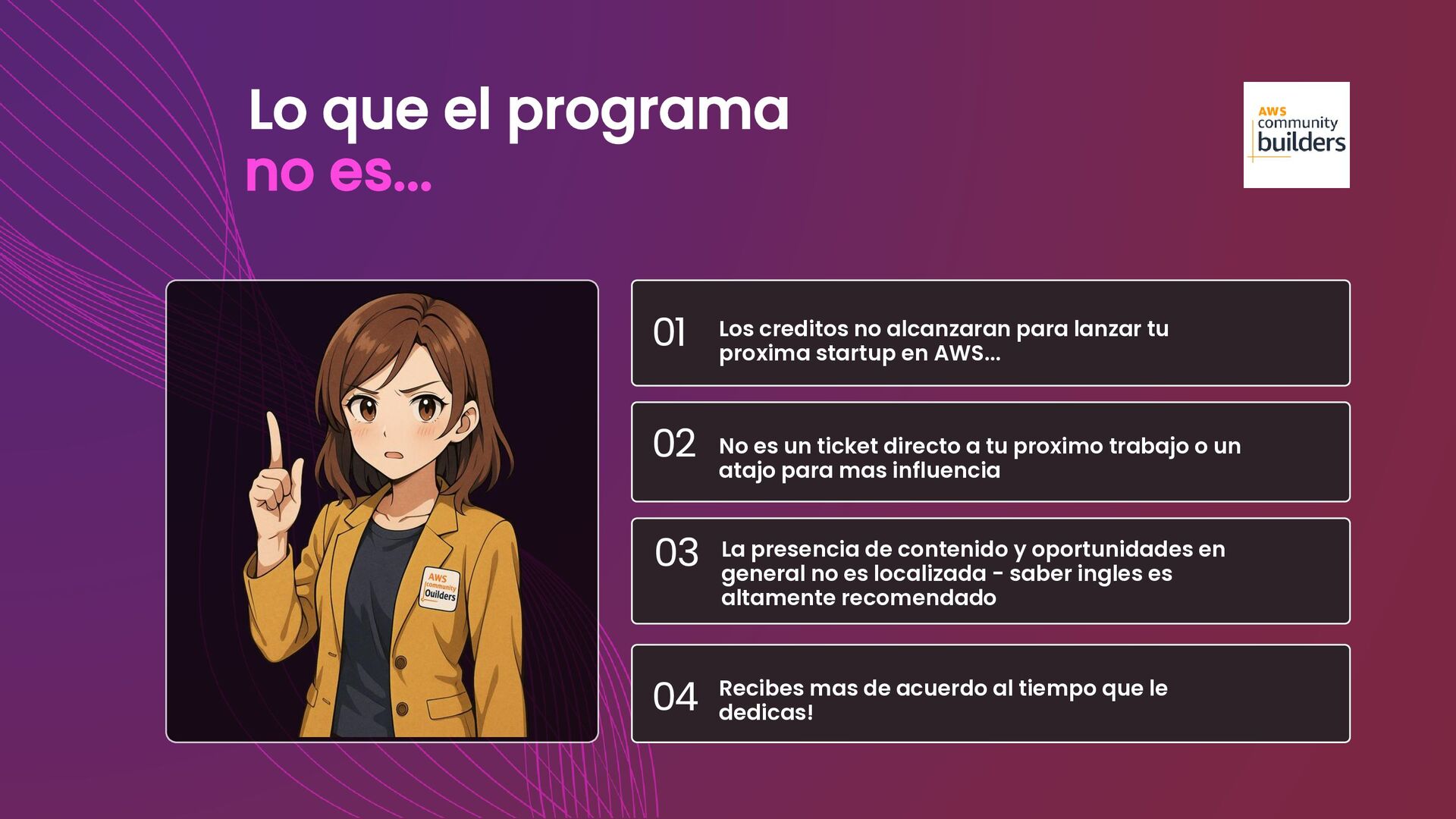mas de acuerdo al tiempo que le dedicas! No es un ticket directo a tu proximo trabajo o un atajo para mas influencia Los creditos no alcanzaran para lanzar tu proxima startup en AWS... 03 La presencia de contenido y oportunidades en general no es localizada - saber ingles es altamente recomendado