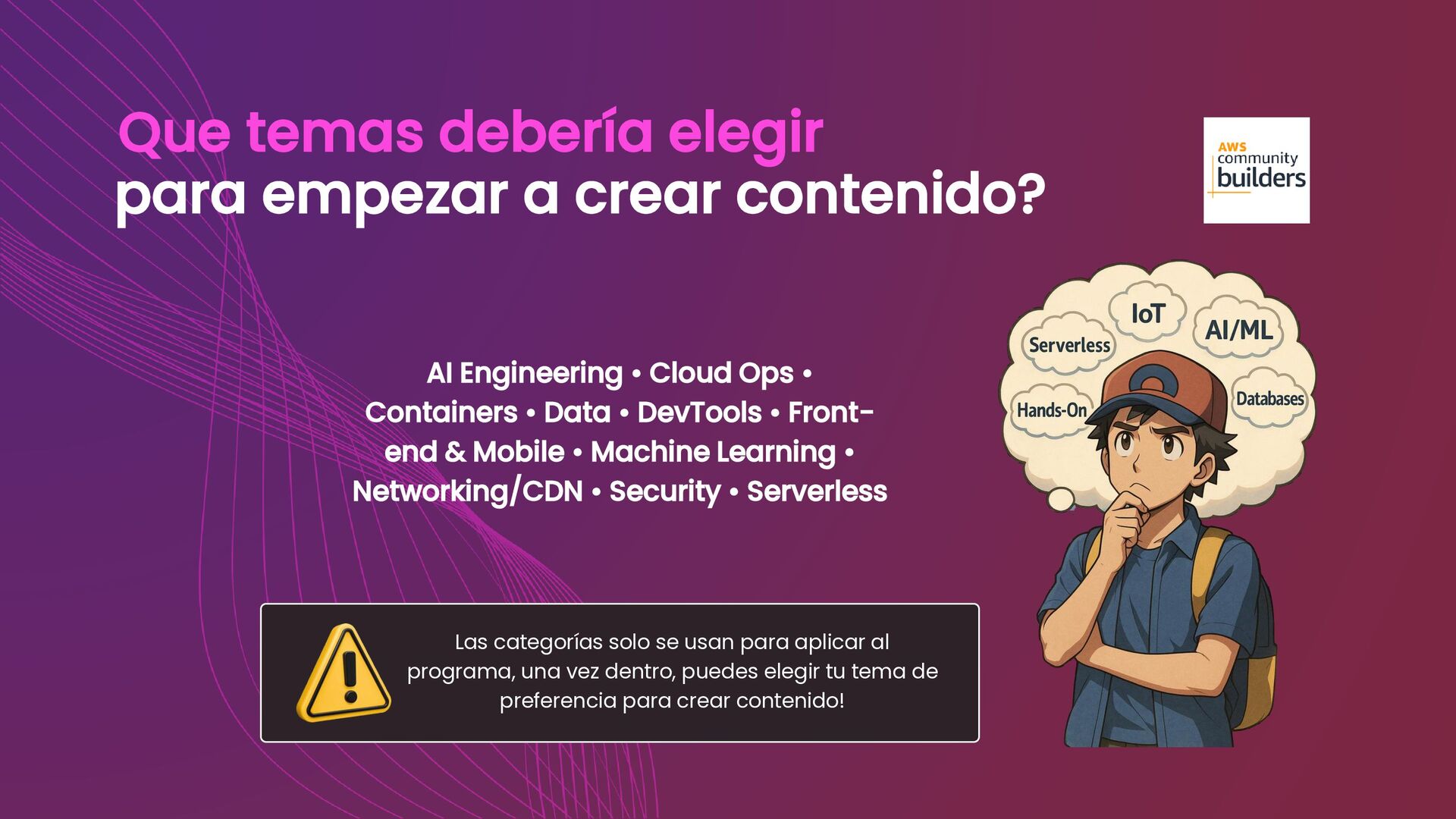 DevTools • Front- end & Mobile • Machine Learning • Networking/CDN • Security • Serverless Que temas debería elegir para empezar a crear contenido? Las categorías solo se usan para aplicar al programa, una vez dentro, puedes elegir tu tema de preferencia para crear contenido!