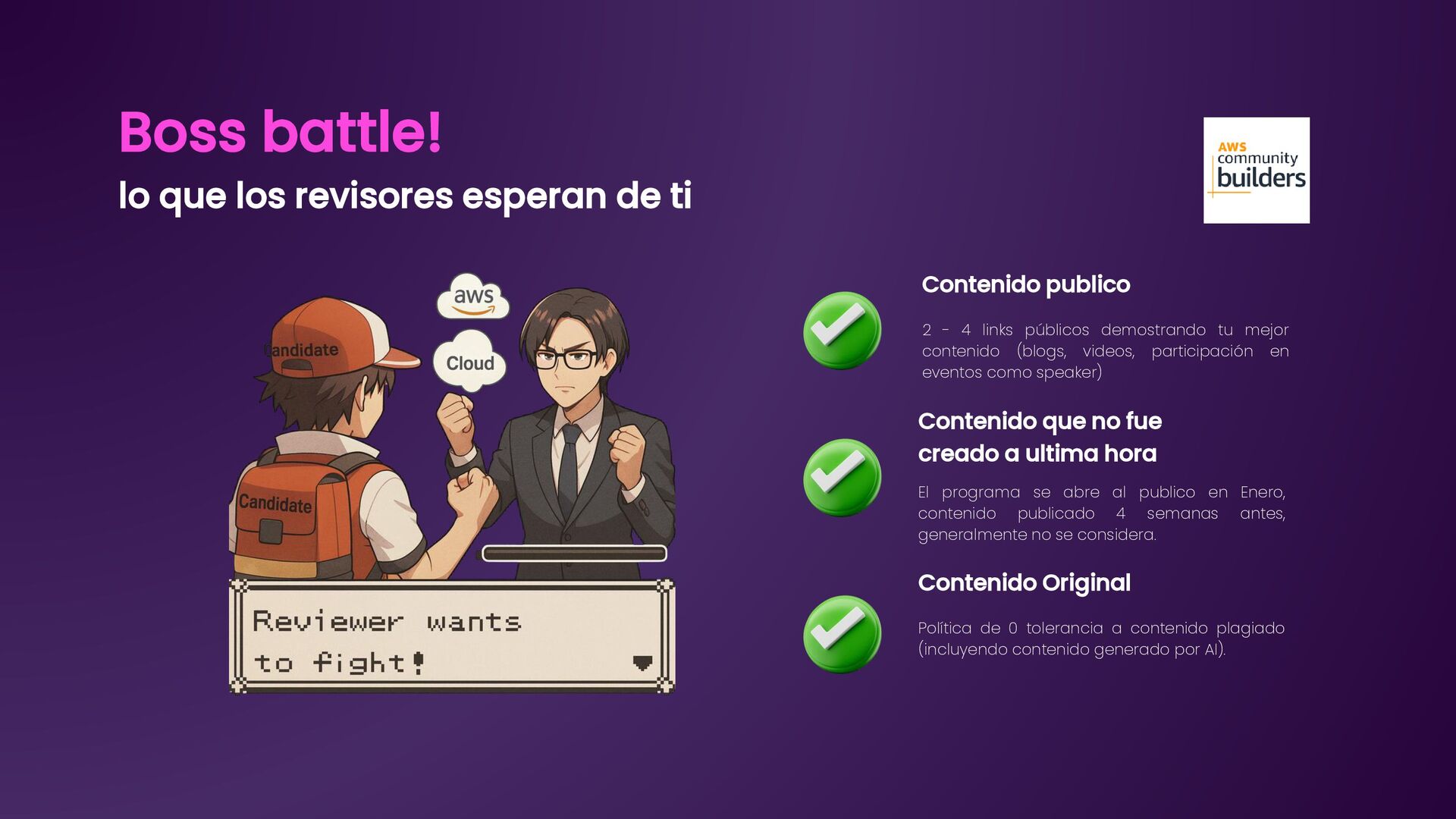 - 4 links públicos demostrando tu mejor contenido (blogs, videos, participación en eventos como speaker) El programa se abre al publico en Enero, contenido publicado 4 semanas antes, generalmente no se considera. Contenido publico Contenido que no fue creado a ultima hora Política de 0 tolerancia a contenido plagiado (incluyendo contenido generado por AI). Contenido Original