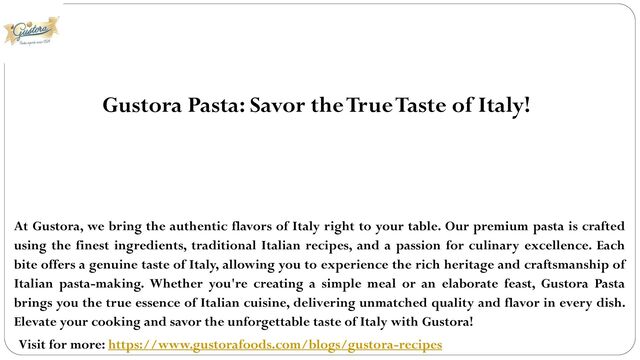 At Gustora, we are passionate about bringing the authentic taste of Italy right to your kitchen. Our premium pasta is crafted with the finest ingredients and traditional Italian techniques, offering you a genuine, unforgettable Italian dining experience. From the rolling hills of Tuscany to the bustling streets of Rome, we’ve captured the essence of Italy in every bite of our carefully crafted pasta. Visit for more: https://www.gustorafoods.com/blogs/gustora-recipes