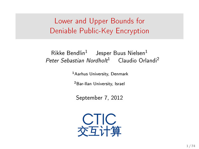 Enc, Dec, Fake) and n = poly(k) dene the parallel self-composition Πn = (KeyGenn, Encn, Decn, Faken ) KeyGenn(1κ) = KeyGen(1κ). Encn pk(m 1 , . . . , mn; r 1 , . . . , rn) = (Encpk(m 1 ; r 1 ), . . . , Encpk(mn; rn)) Decn sk(c 1 , . . . , cn) = (Decsk(c 1 ), . . . , Decsk(cn)). Faken (sk, (c 1 , . . . , cn), (m 1 , . . . , mn)) = sk where sk 0 = sk, sk 1 ← Fake(sk 0 , c 1 , m 1 ), sk 2 ← Fake(sk 1 , c 2 , m 2 ), . . . , skn ← Fake(skn−1 , cn, mn) and skn = sk . 36 / 74